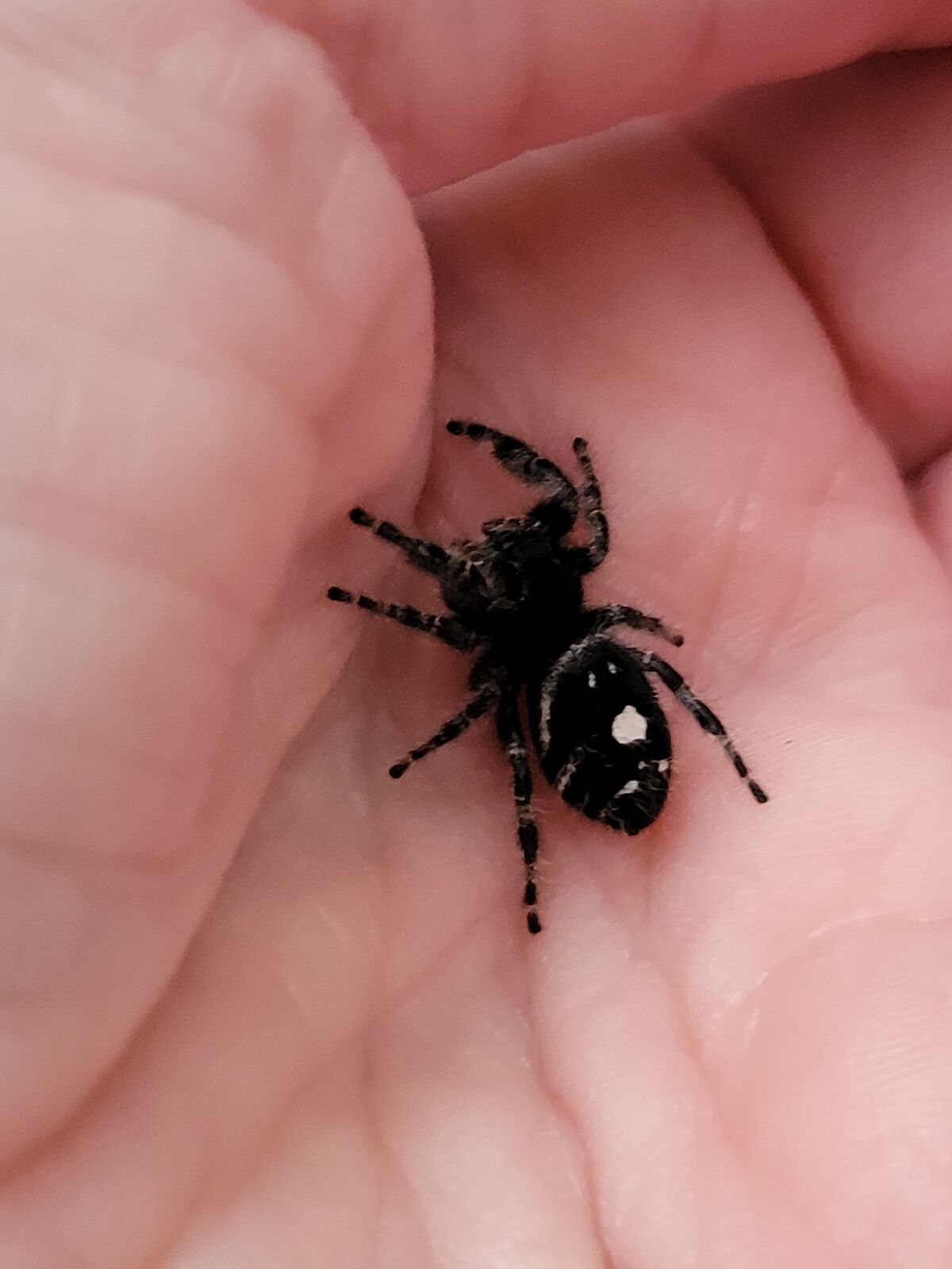 Meet Astrid, my female Bold Jumper (Phidippus Audax). She's black with grey and has white markings on her abdomen and has green chilicerae. She's a sub-adult jumper. It's wild caught. (Cash Only)