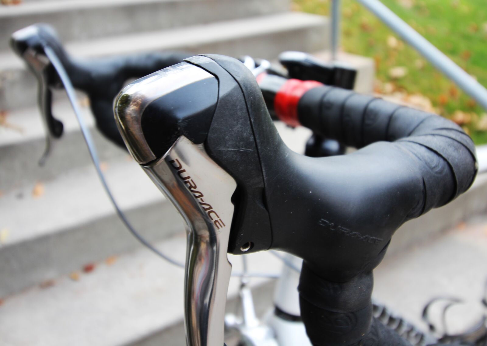 Shimano Dura Ace shifters and derailleurs. (The top of Shimano's road groupset range; "pro"-level gear.)