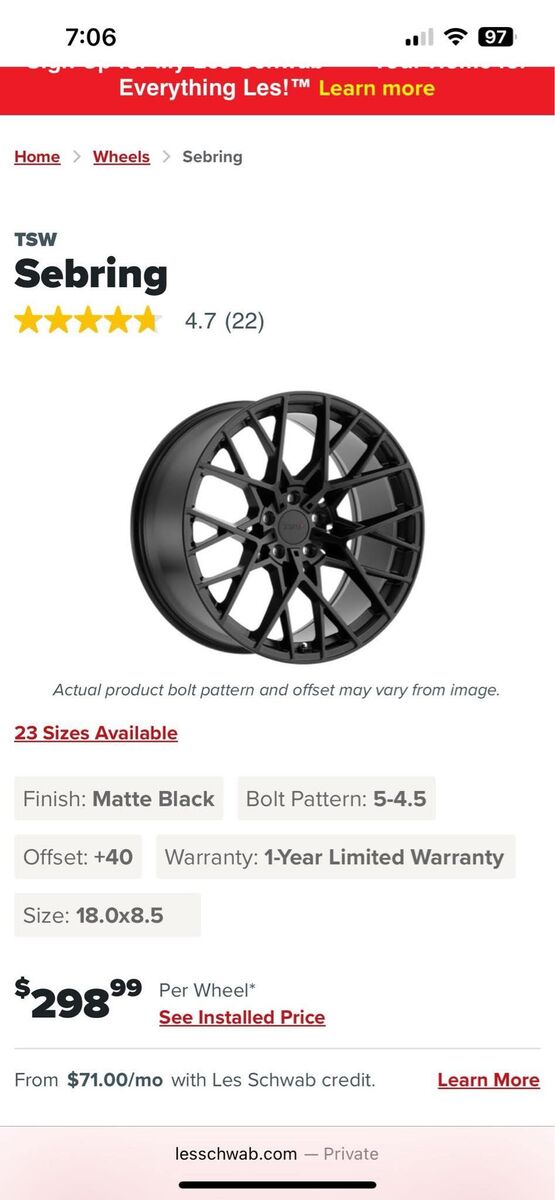 ApplePayThank you for seeing my ad. I have for sale my Continental and Sebring wheels. The tires are nearly new. Tread is at 10.0 all weather tires.