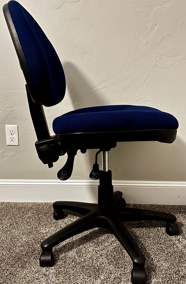 The Office Master BC44 task chair features paddle controls for height, backrest pivot, back height adjustment, and seat and back tilting. Equipped with a pneumatic lift, it offers essential ergonomic adjustments for users who prefer straightforward functionality without frequent tweaks. Ideal for basic comfort and support in busy workspaces. Excellent condition. Color: Navy Blue. Original price, $385 + Tax.