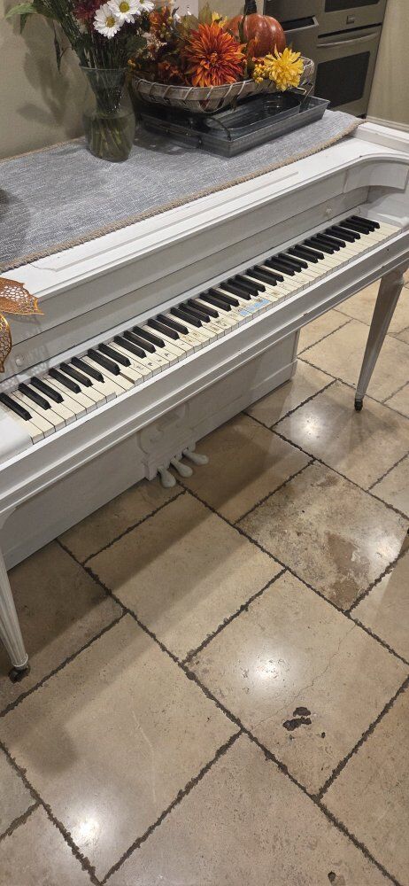 Used piano. Needs tlc or use as is. Plays and sounds great. it was originally a wood grain and my wife painted it white. could easily be restored. There is a bench that matches and is free also.