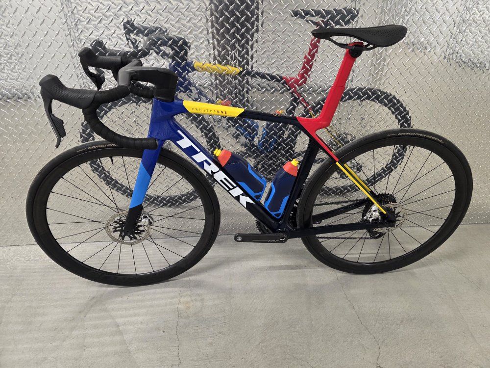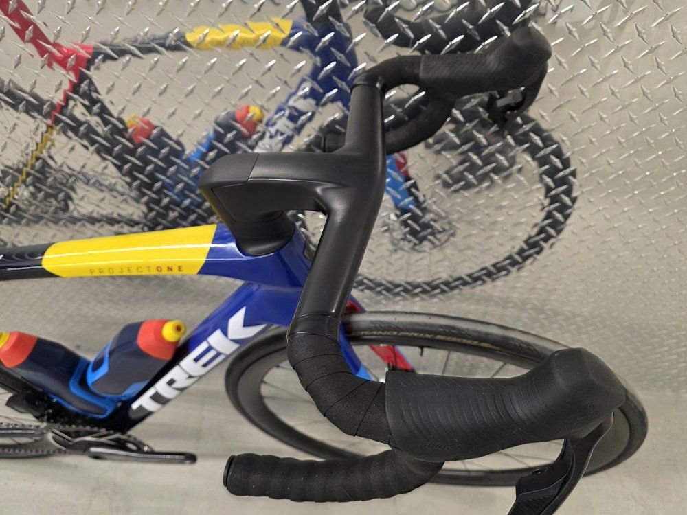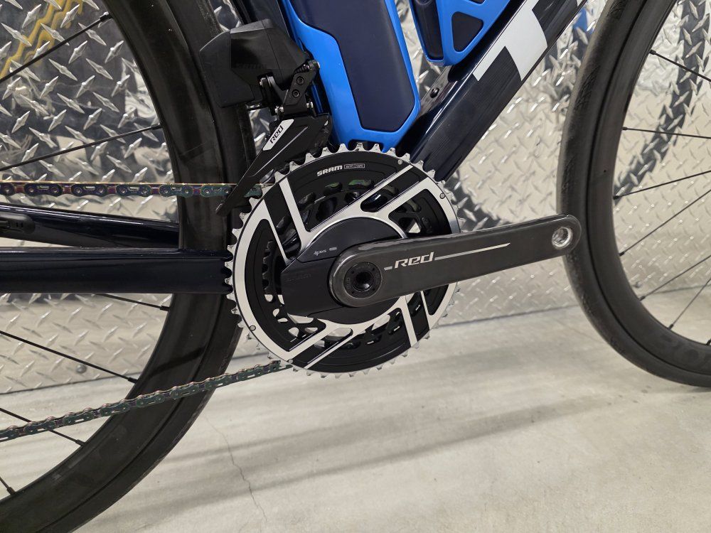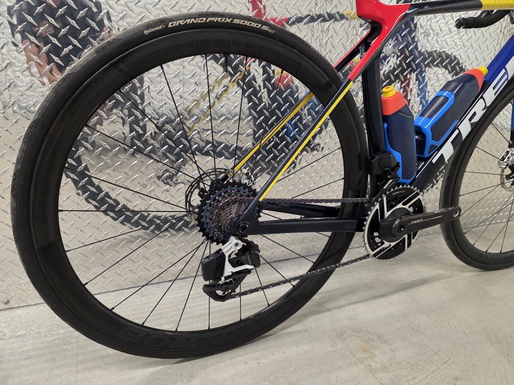 Team Edition Sram Red E1 Shifters Team Edition Sram Red E1 Power meter 170mm Sram Red E1 Axs Derailleur Sram Red 10-33 Oilslick cassette Sram Red Oilslick chain (waxed) Sram Red chainrings 48/35 Sram Paceline 180/160 rotors Trek integrated aerobars 42/100 S-Works Phenom Mirror 143 saddle Bontrager RSL 38 Aeolus carbon tubeless wheelset w/ceramic bearings
