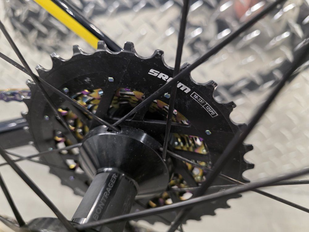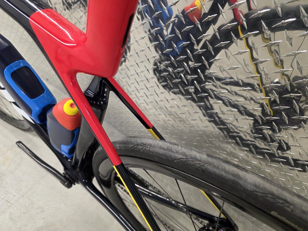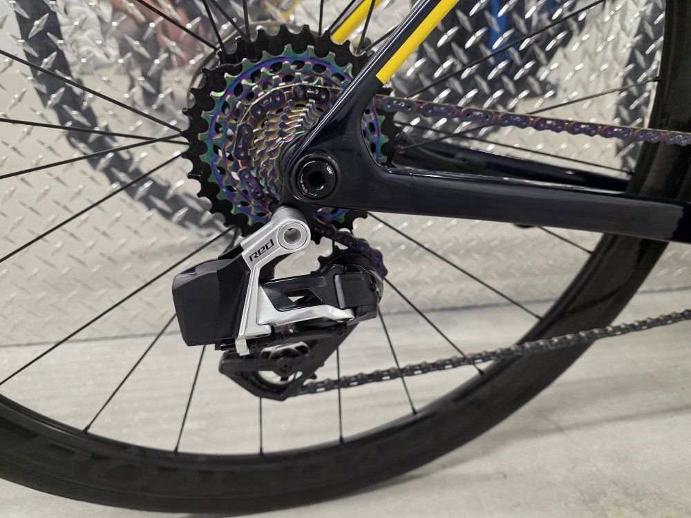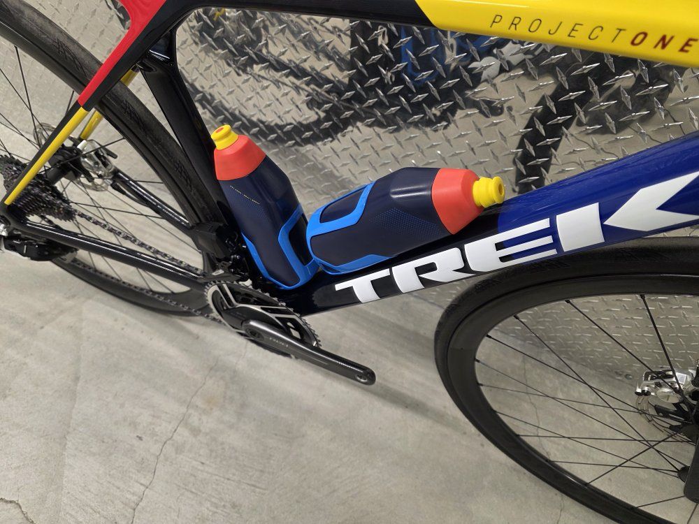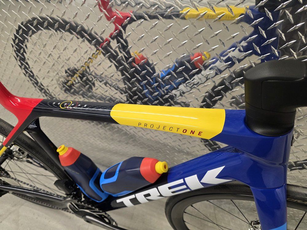 Team Edition Sram Red E1 Shifters Team Edition Sram Red E1 Power meter 170mm Sram Red E1 Axs Derailleur Sram Red 10-33 Oilslick cassette Sram Red Oilslick chain (waxed) Sram Red chainrings 48/35 Sram Paceline 180/160 rotors Trek integrated aerobars 42/100 S-Works Phenom Mirror 143 saddle Bontrager RSL 38 Aeolus carbon tubeless wheelset w/ceramic bearings