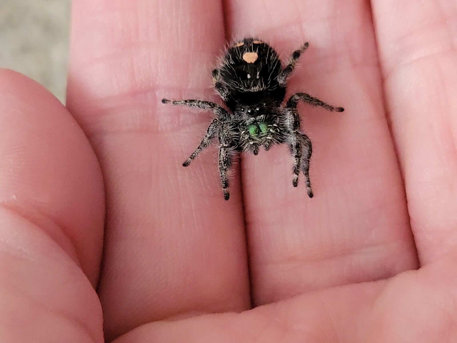 Meet Athena, my female Bold Jumper (Phidippus Audax). She's black with grey and has faded white markings on her abdomen and has green chilicerae. She's an adult jumper. It's wild caught. (Cash Only)