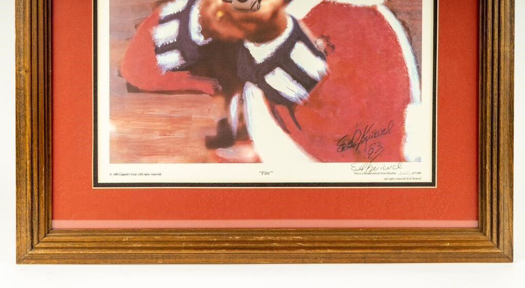 Framed print entitled “Fire” by Evel Knievel, personally signed and numbered. Depicts a British “Red Coat” solider firing a gun at the viewer. Dated 1983. Lower right: Signed twice and numbered 1365 / 5000. Condition: Excellent!