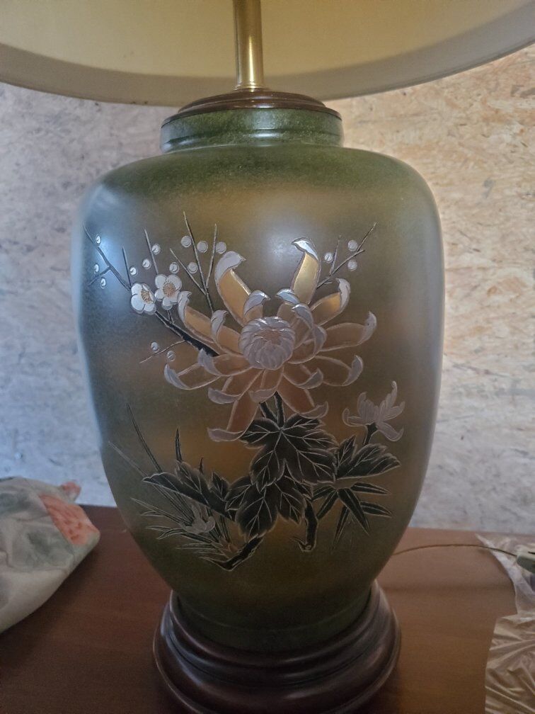 antique Japanese bronze vase that has been converted into a table lamp. The vase dates to the Meiji period (late 19th century) and features a patinated, gilt-bronze body with bas-relief decorations of chrysanthemum flowers and leaves.