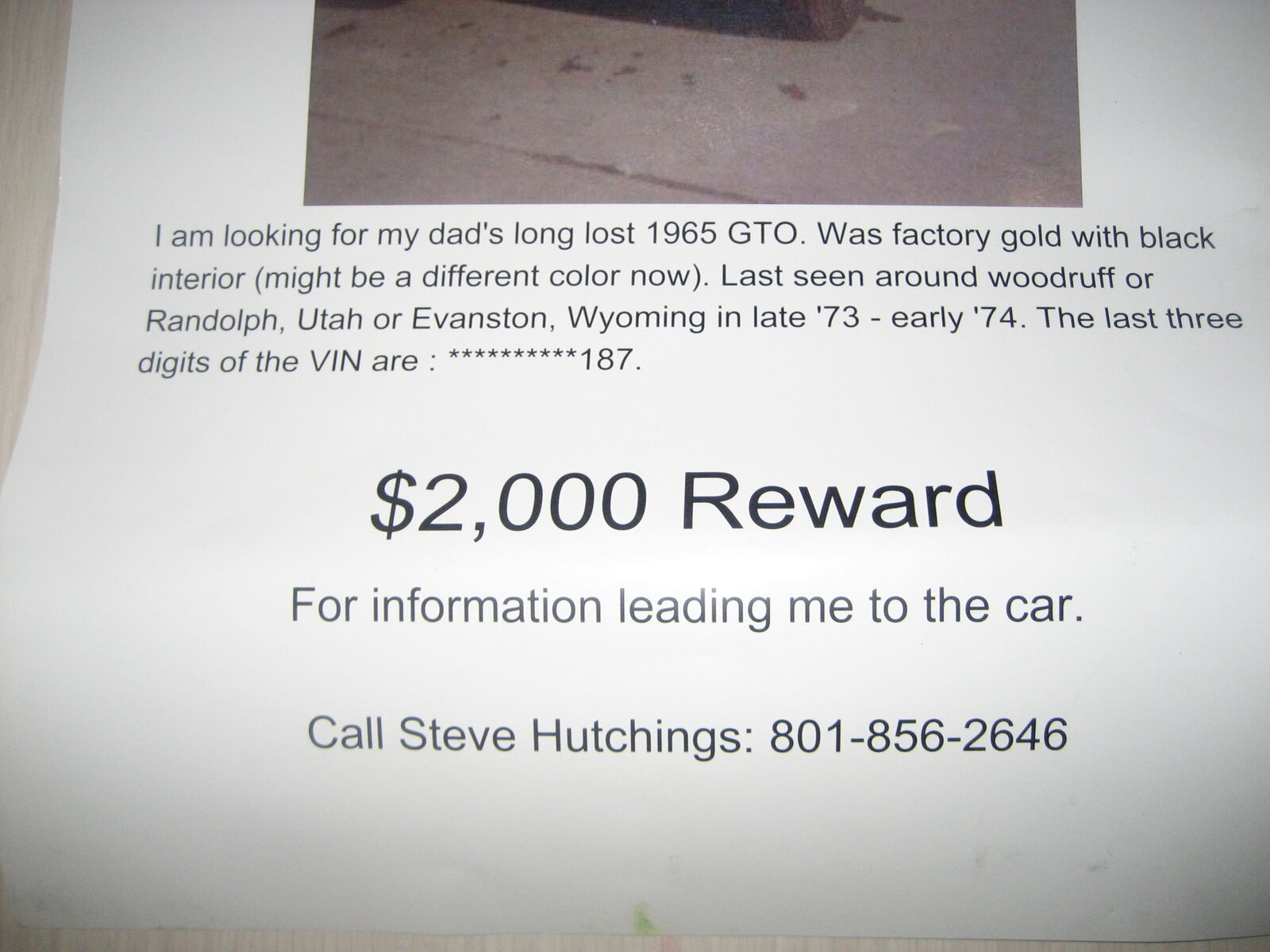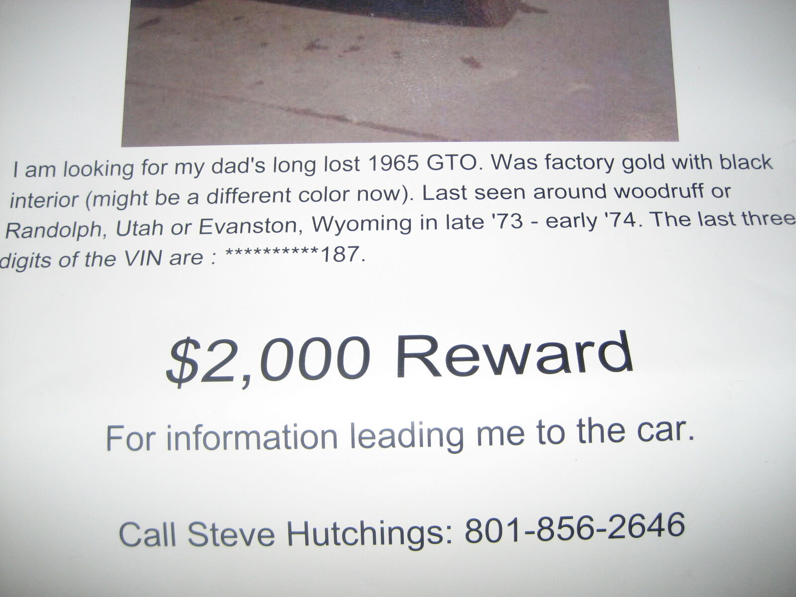 Looking for my fathers Gold 1965 Pontiac GTO. Was equipedw/ 389 Tri Power 4 spd black interior. Last 3 #s of the Vin are 187. Last seen in Northern Utah in the early 1970'S. Will pay a $2,000 finders fee for imformation leading to its location.