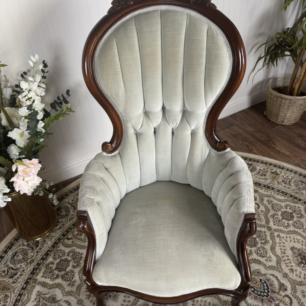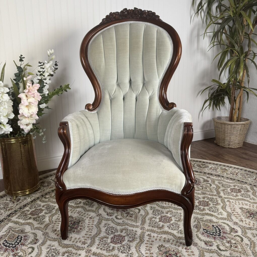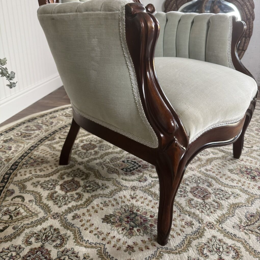 ApplePayBeautiful vintage Victorian-style high-back chair in a soft sage-green velvet with dark wood frame. Super comfy and sturdy — perfect for a reading nook, bedroom, or statement corner. Perfect for grandmillennial, French country, romantic, classic, or traditional interiors.