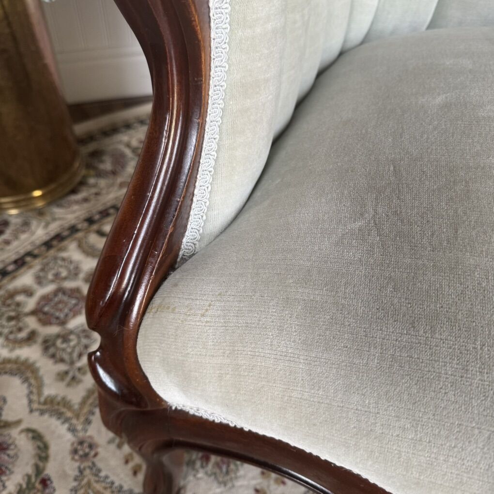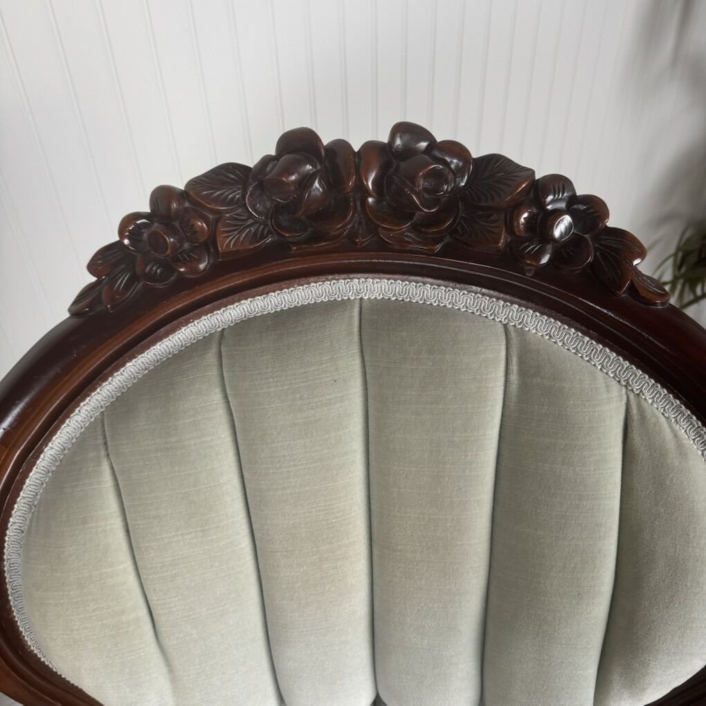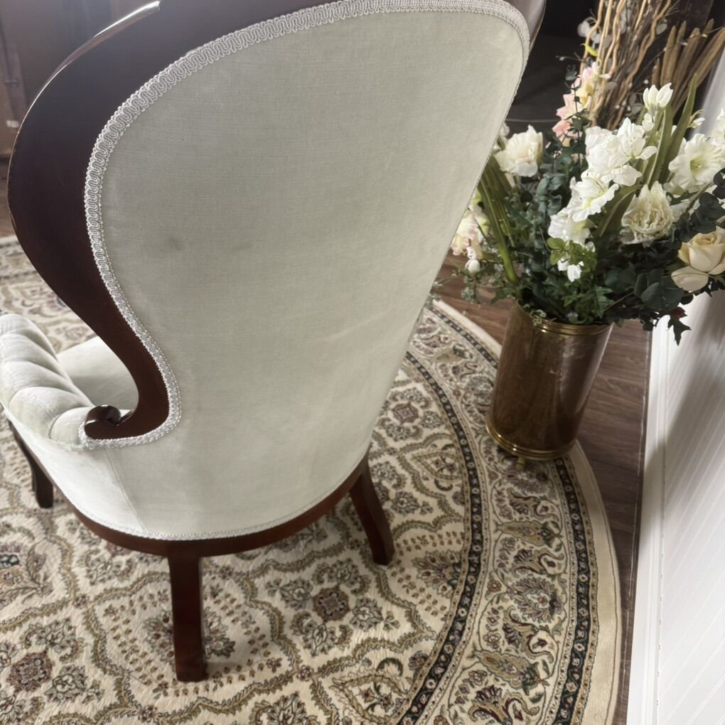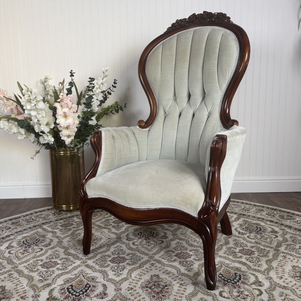 ApplePayBeautiful vintage Victorian-style high-back chair in a soft sage-green velvet with dark wood frame. Super comfy and sturdy — perfect for a reading nook, bedroom, or statement corner. Perfect for grandmillennial, French country, romantic, classic, or traditional interiors.