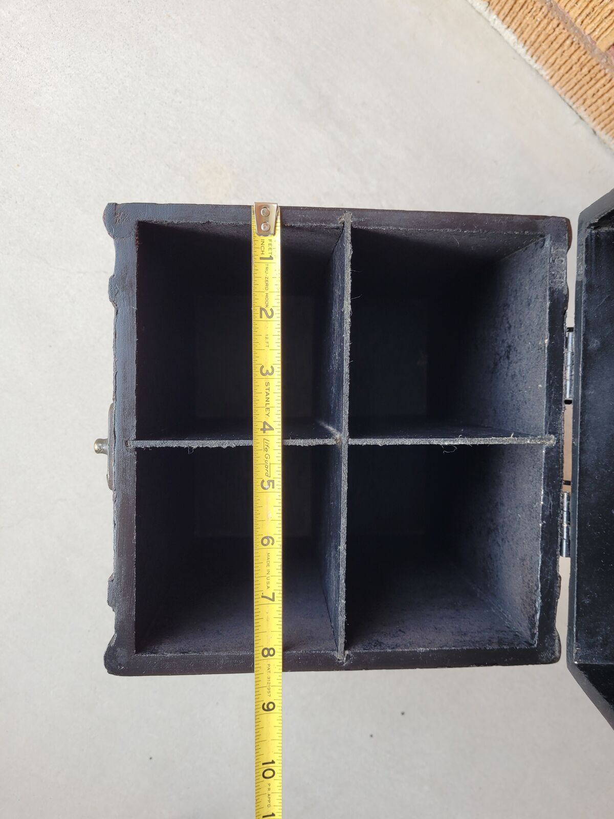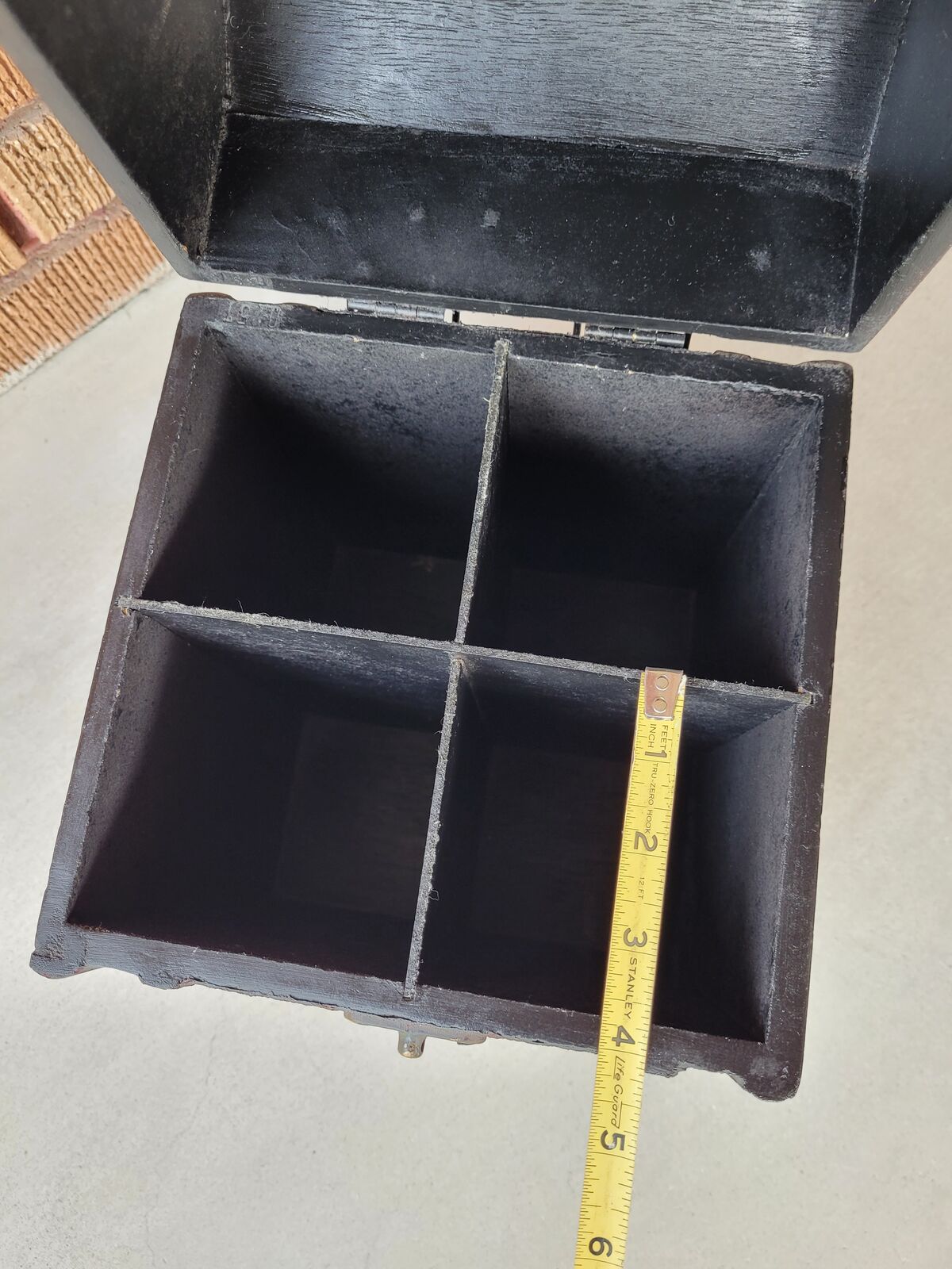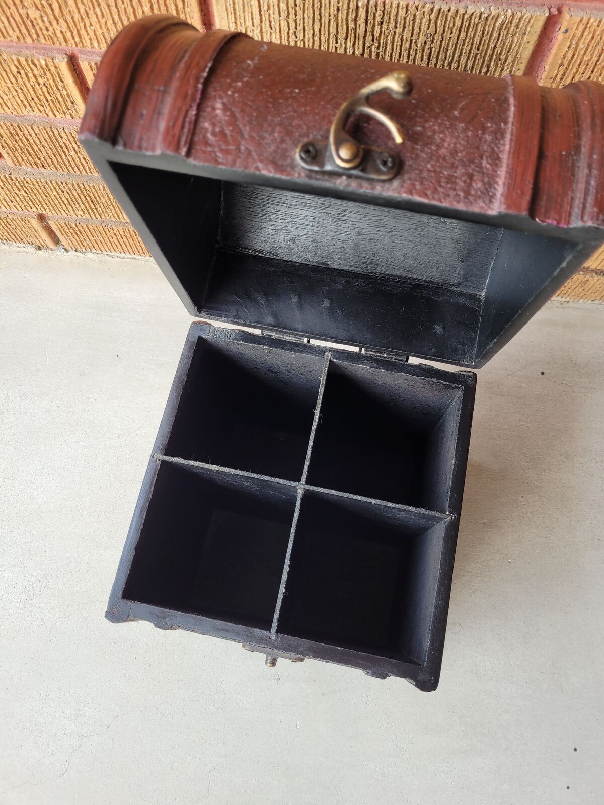 It features 4 compartments for 4 wine bottles or any other things you may want to stow away. A slide hook latch to secure the lid, and a black interior.