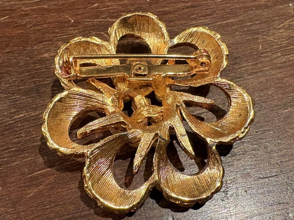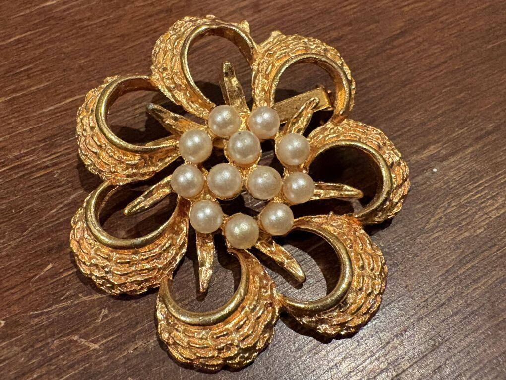 I have a vintage gold tone pin or brooch. It looks like a flower and has several small fake pearls in the center. It is just over 1 1/2 inches across. See my other ads for jewelry, artwork, home decor and more.