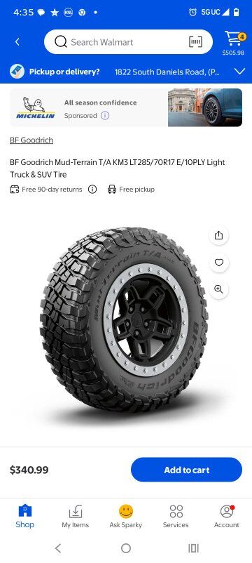ApplePayI have 4 matching LT 285/70R17 BF Goodrich Radial MT KM3 tires with a 2023 code... These 285/70/17 mud terrain tires have a very healthy amount of tread at 12/32 of an inch ....Despite being MT tires they are great in snow and on the highway too. they are 341 plus tax at Walmart currently. this is the exact same tire.... huge savings on a set of four.. see the last photo. I am in Heber but I am often in Wasatch Weber Davis Summit Utah and Salt Lake counties....I can often meet and sometimes even deliver. please text or call me at 801-623-2458. I take all forms of payment except PayPal. thank you for your consideration.