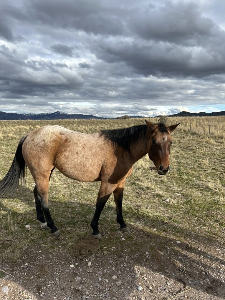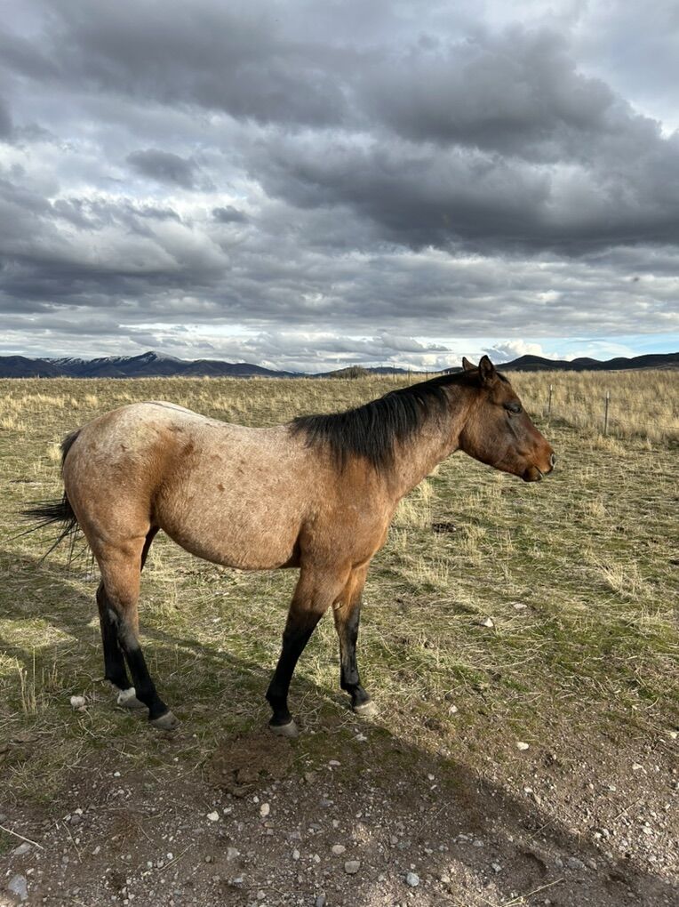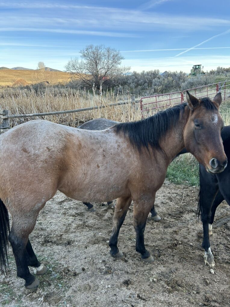 Coming 3 Year old red roan filly. 15 hands. Follow her lines and you’ll find Blue Valentine, Dry Doc, Gunsmoke, and many more good foundation lines. Halter broke and trailer broke. You can copy and paste the links below to watch a couple short videos of her. Seems like she’ll be an easy starter. https://youtu.be/3jR-jYLDUP8?feature=shared
