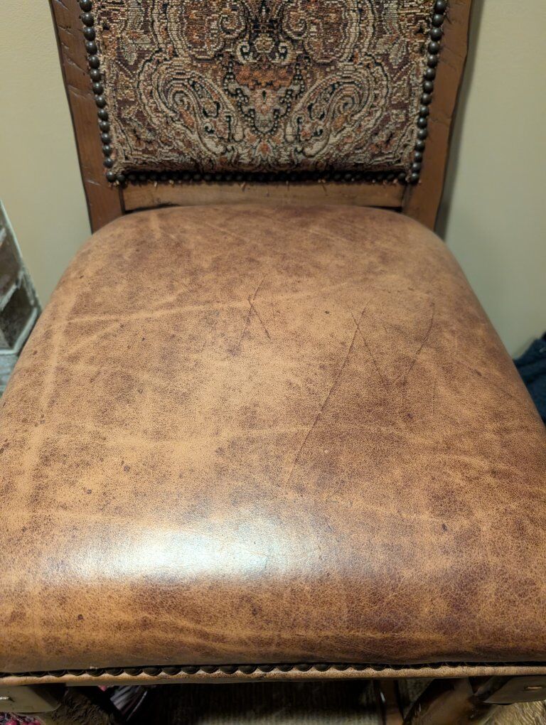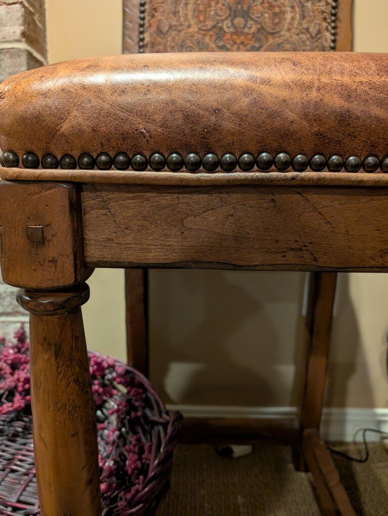 Beautiful distressed wood legs, genuine leather seat and upholstered back with beading accents. Excellent quality, designer made barstools. Set of four.