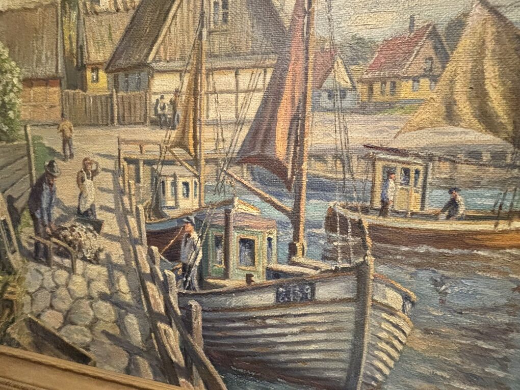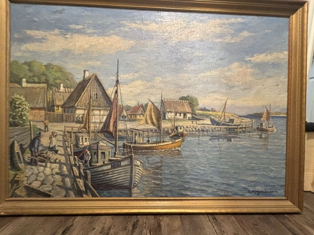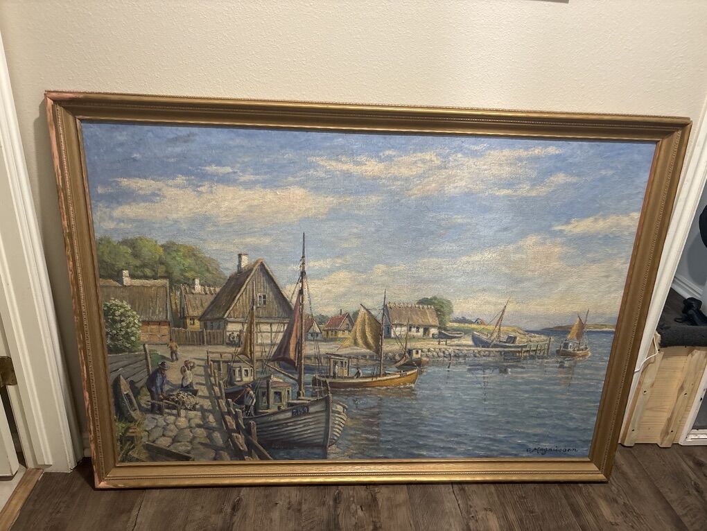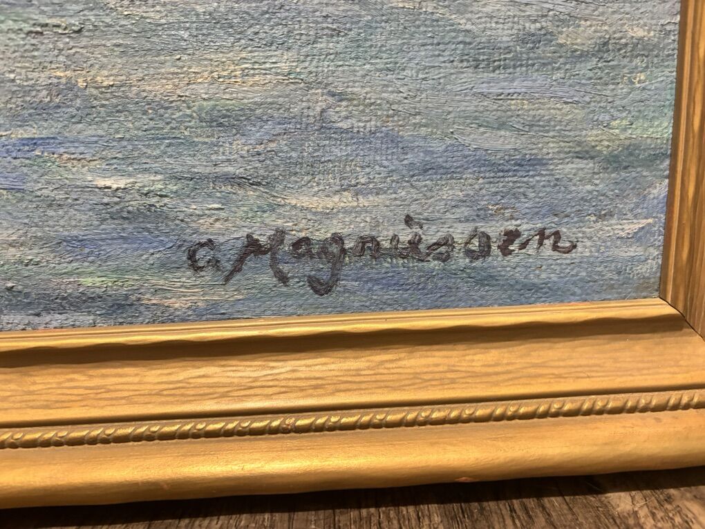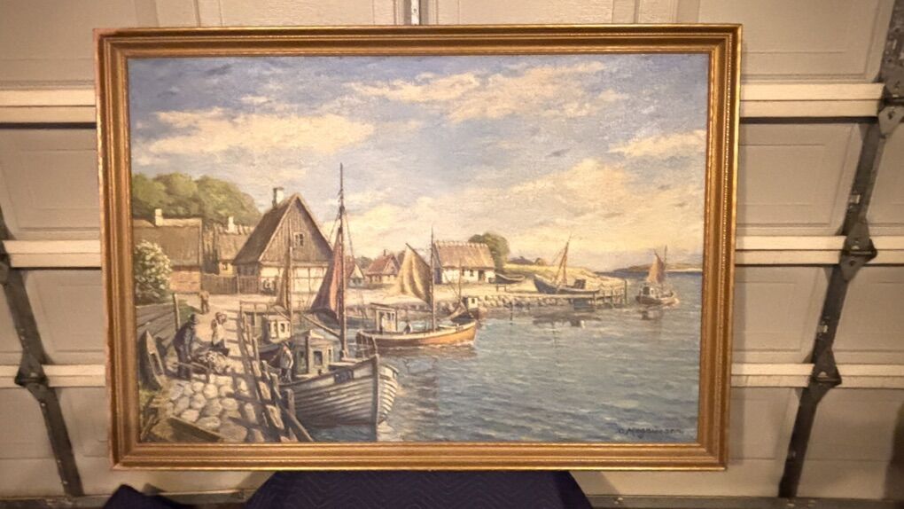 S P E C I A L I S T O PI N I O N Hello, this item is a large oil painting on wood panel signed “C. Magnusson” in the lower right corner. The work depicts a harbor scene with moored sailboats and traditional European wooden houses, painted in a naturalistic style with Impressionist undertones. The artist’s brushwork emphasizes texture and atmospheric light, suggesting a Northern European origin, possibly Scandinavian or Dutch, dating from the mid-20th century. The use of a wooden panel rather than canvas is consistent with Nordic and continental European practices of the period, offering durability and depth to the pigments. Measuring approximately 59.5 by 42 inches, the painting is substantial and well framed. While the artist “C. Magnusson” is not among the documented names in major art auction records, similar regional landscape painters active between the 1930s and 1960s produced comparable maritime compositions for both gallery and private sale markets. Based on size, execution, and aesthetic quality, its fair market value would be over $700-$1200