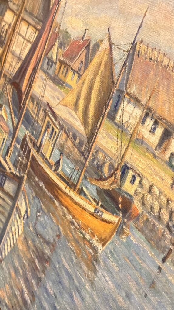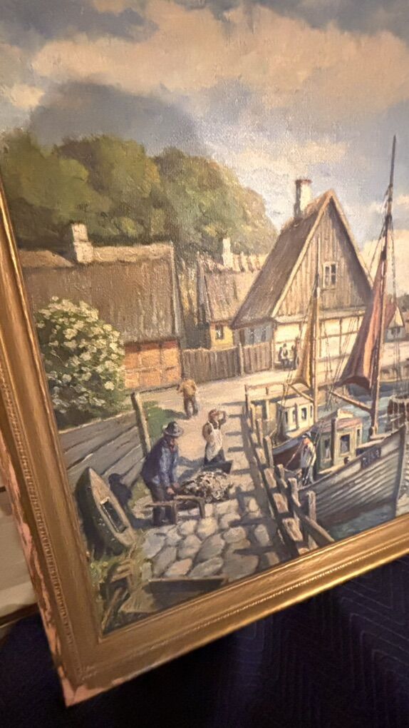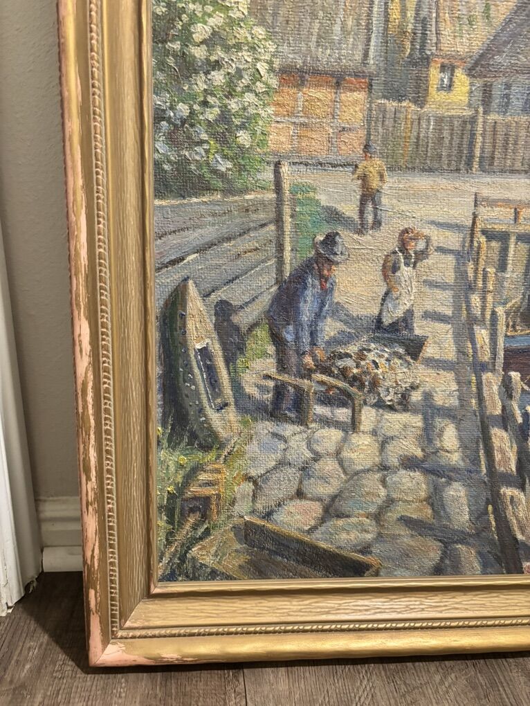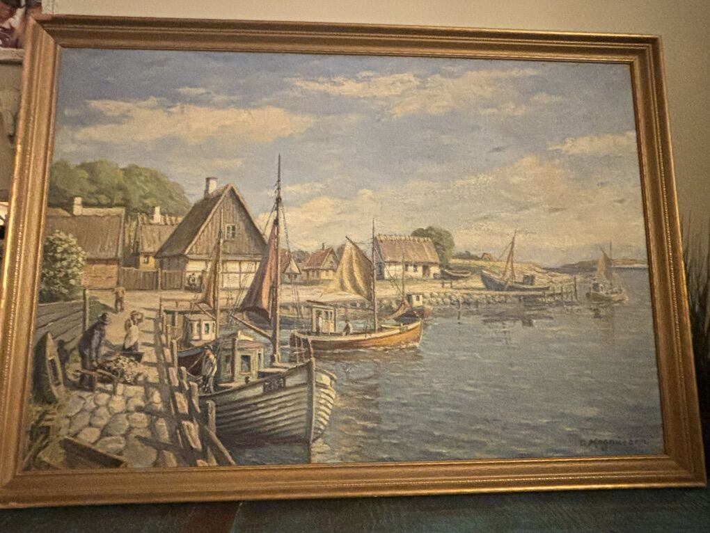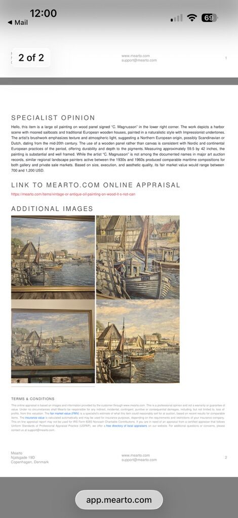 S P E C I A L I S T O PI N I O N Hello, this item is a large oil painting on wood panel signed “C. Magnusson” in the lower right corner. The work depicts a harbor scene with moored sailboats and traditional European wooden houses, painted in a naturalistic style with Impressionist undertones. The artist’s brushwork emphasizes texture and atmospheric light, suggesting a Northern European origin, possibly Scandinavian or Dutch, dating from the mid-20th century. The use of a wooden panel rather than canvas is consistent with Nordic and continental European practices of the period, offering durability and depth to the pigments. Measuring approximately 59.5 by 42 inches, the painting is substantial and well framed. While the artist “C. Magnusson” is not among the documented names in major art auction records, similar regional landscape painters active between the 1930s and 1960s produced comparable maritime compositions for both gallery and private sale markets. Based on size, execution, and aesthetic quality, its fair market value would be over $700-$1200