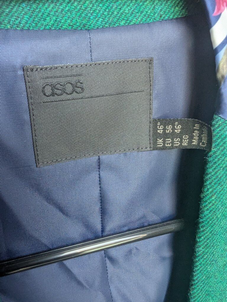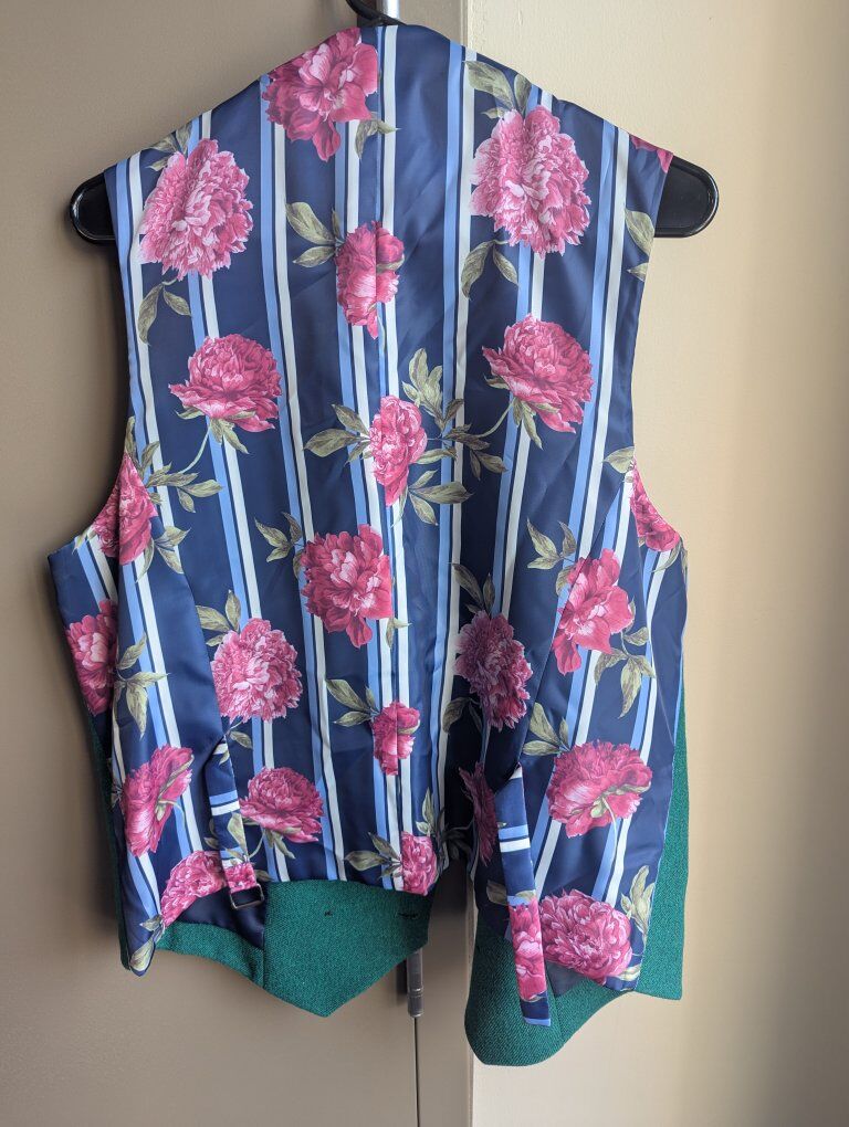GooglePayUnique ASOS tailored vest in emerald green with a stunning contrast floral lining. This piece combines sharp, classic menswear style with a bold modern twist. Size 46R (US). Features a five-button front, front pockets, and a silky interior. Great condition with no flaws.