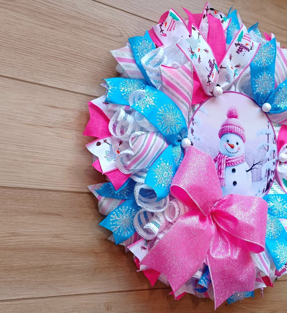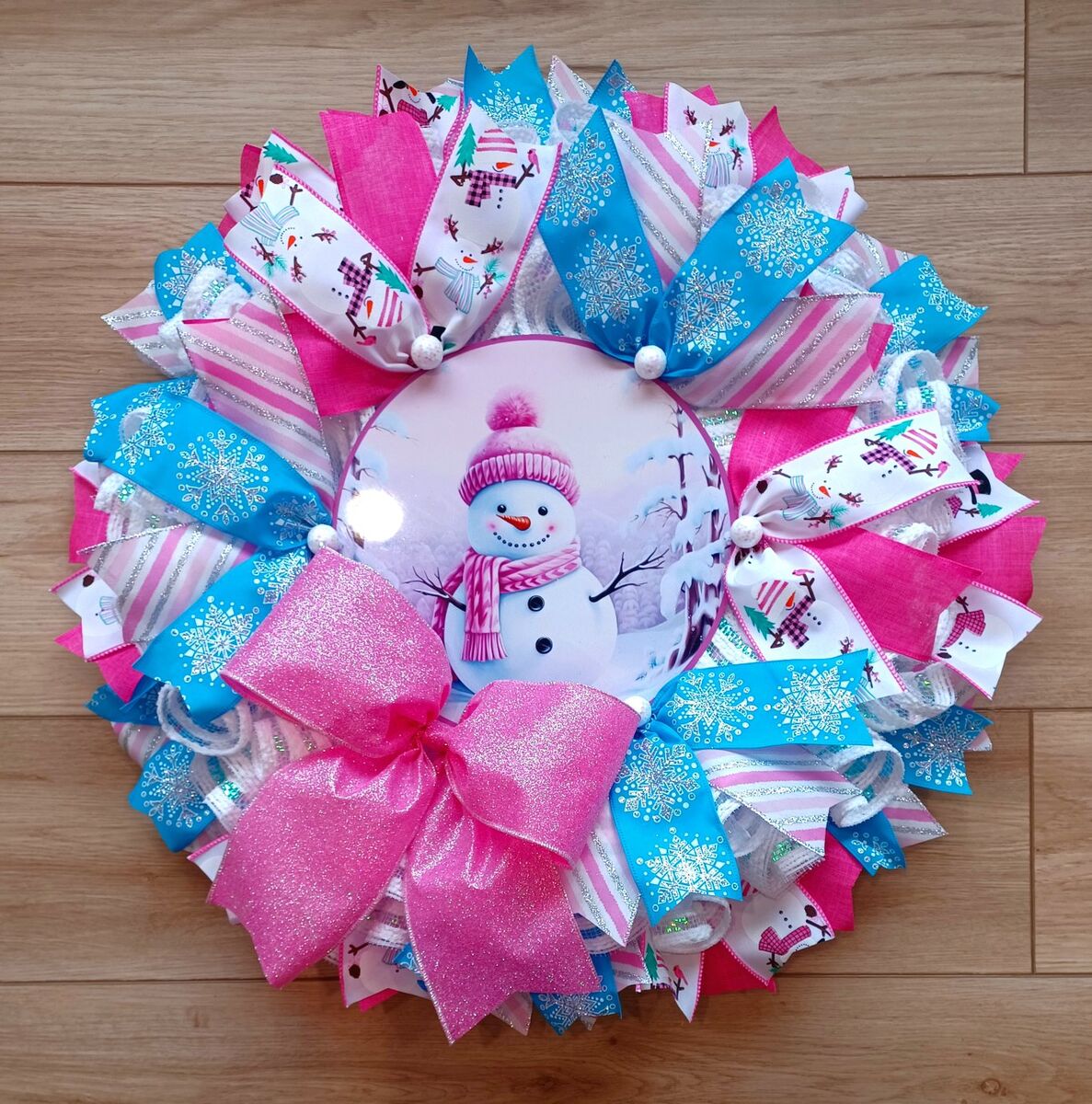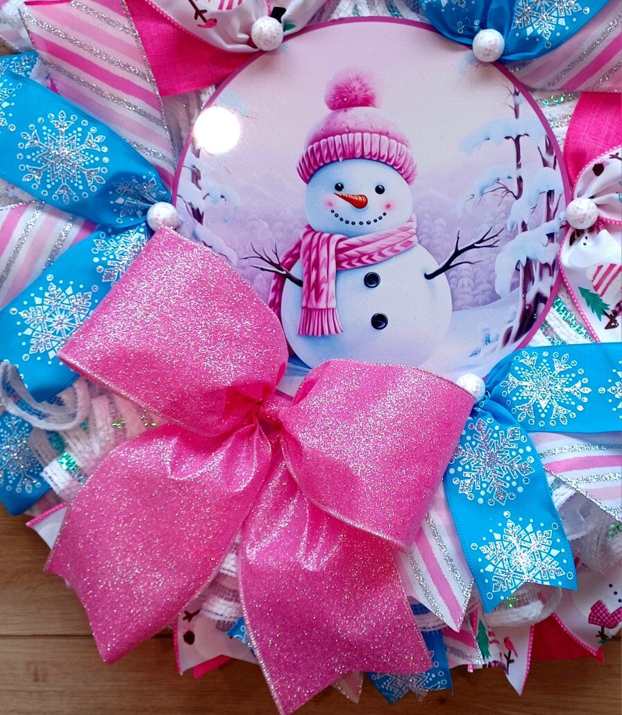 This beautiful handmade 24" Pink Snowman Wreath would be a perfect addition to your Winter decor. It would look amazing hanging on your front door or any room for the season with lots of ribbon and a cute sign ready for display from a smoke free home. I can customize and ship. Just ask!!!