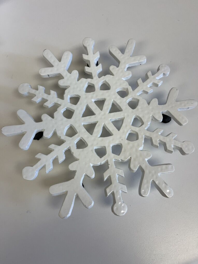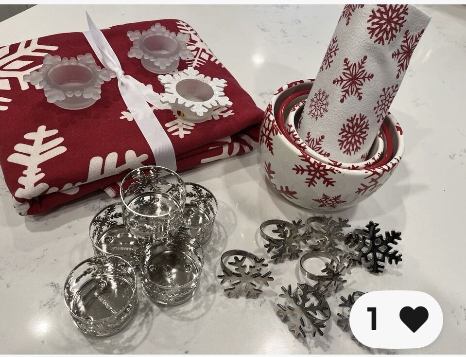 Winter ~ Christmas Snowflake Decor Collection *Target Snowflake Tablecloth - approx. 60 x 110 - Excellent pre-owned condition. *Silver Snowflake Napkins Rings - S/7 *Crate & Barrel Snowflake Nesting Bowls - S/3 *Eddie Bauer Snowflake Tea Candle Holders - S/3 *Silver Snowflake Metal Candle Holders - S/5 *White snowflake trivet. *Snowflake kitchen towel.