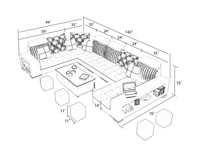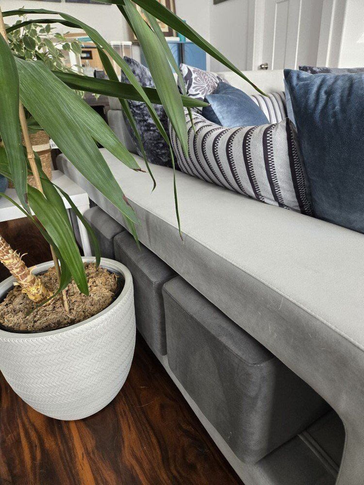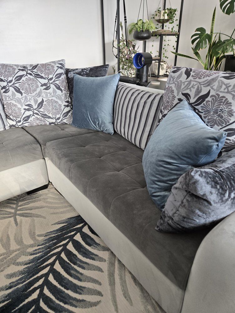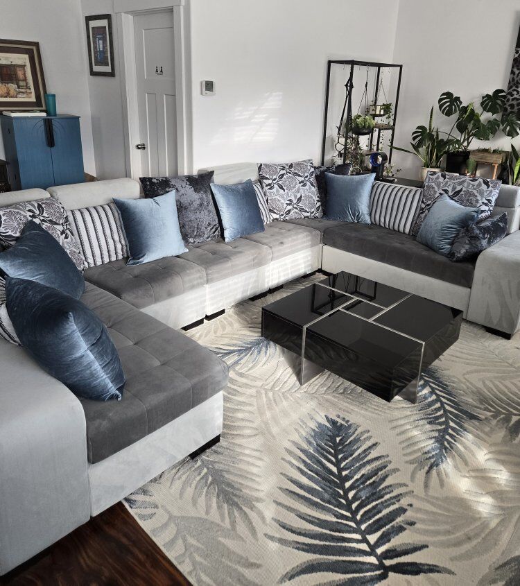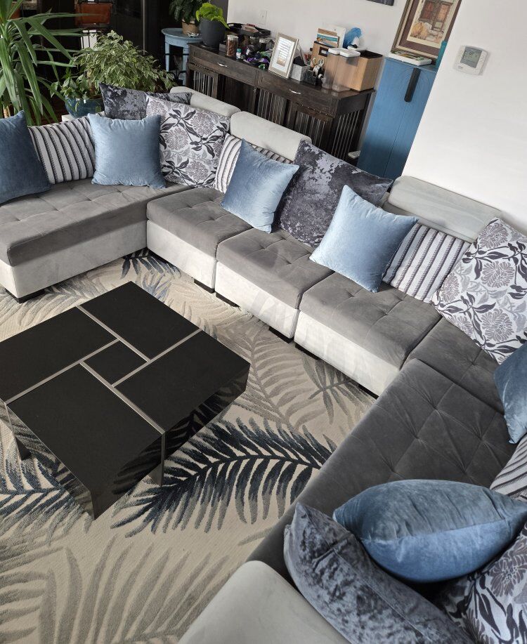 Custom plush various sized pillows, several velvet tones in grays and blues.