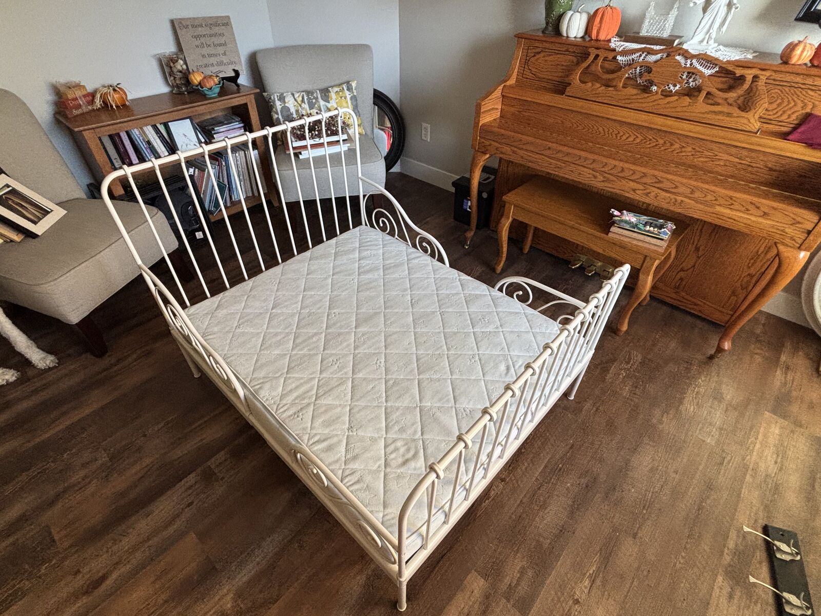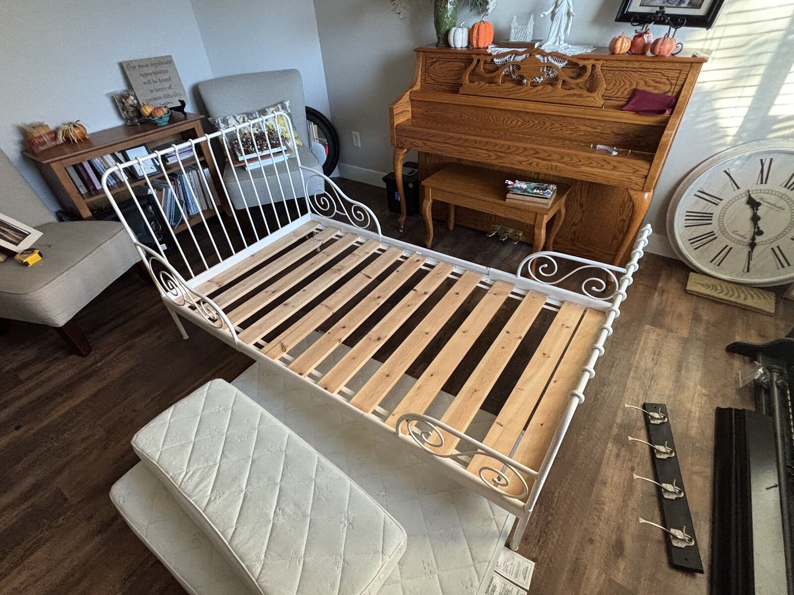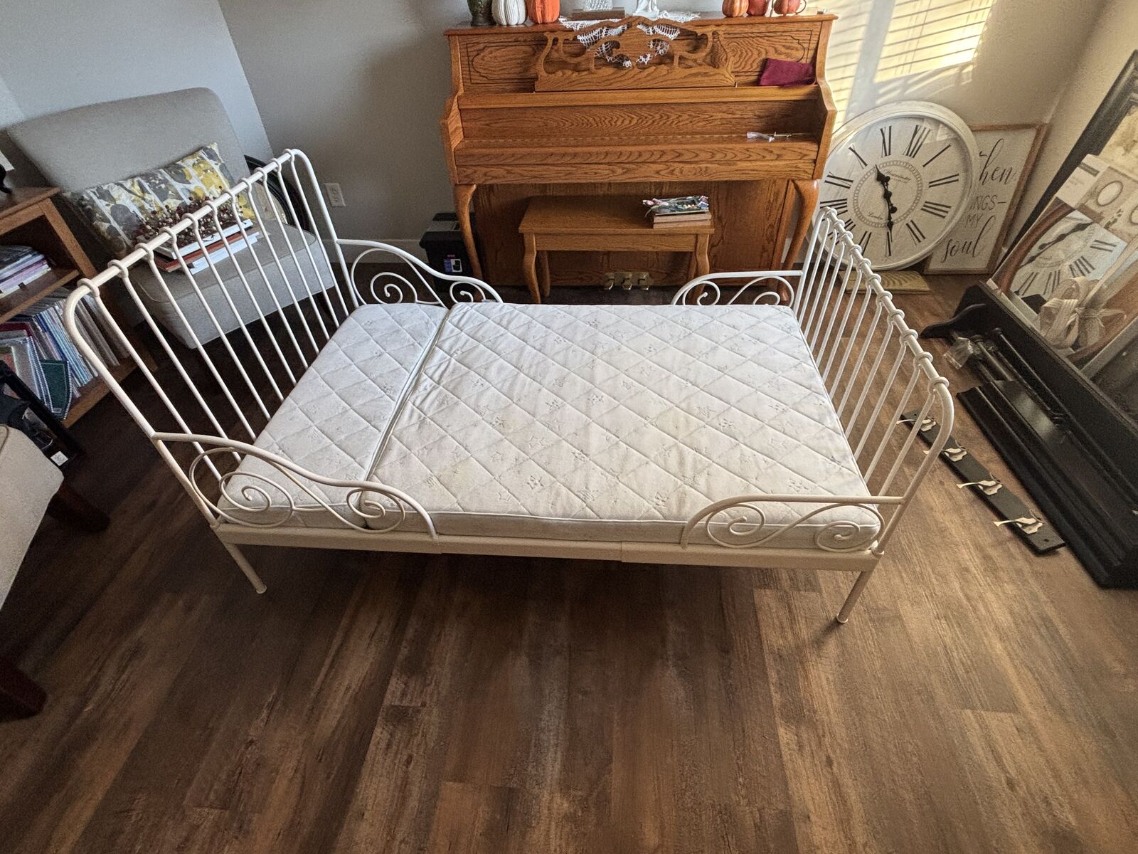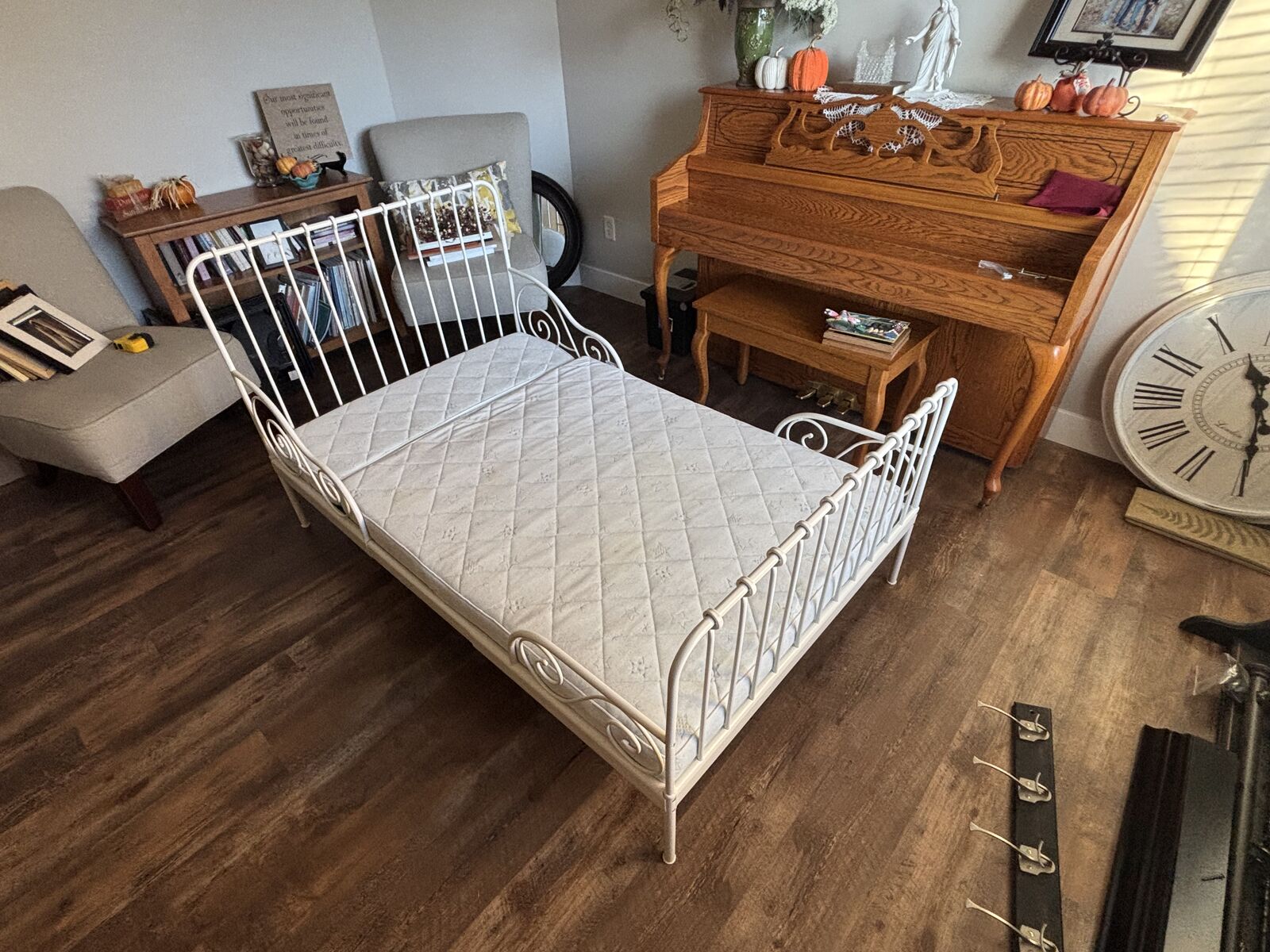 VenmoVery gently used expandable bed from IKEA. At full length, the frame fits a twin box spring and mattress. Mid length is about 64" and the shortest length is 48". Everything included but the twin mattress. Comes with slats, mattress for the short and mid length (see pictures) and mattress cover for those two lengths. No scratches or dings. Call or message if interested.