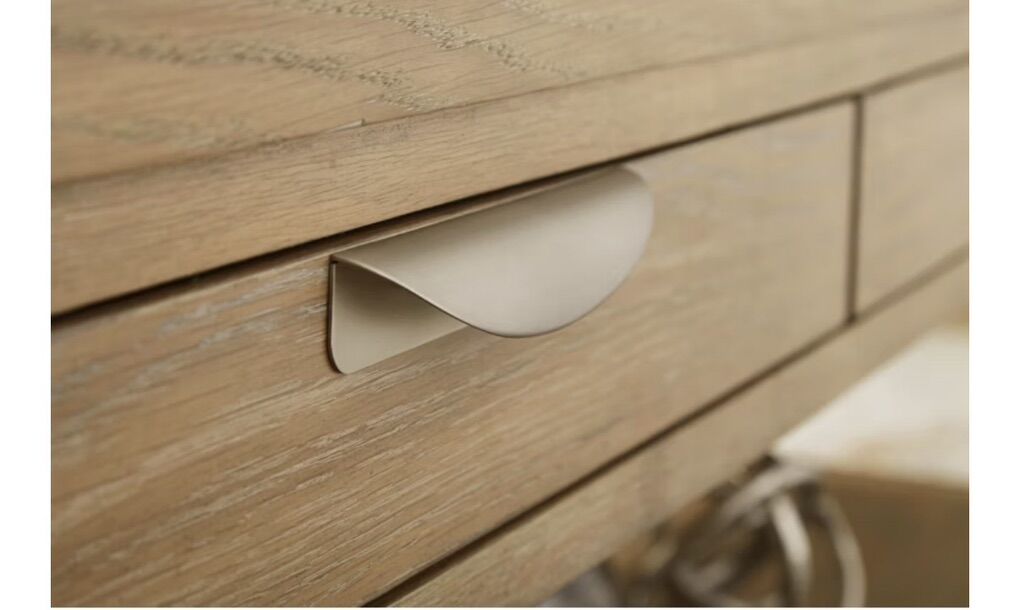 Made with rubberwood solids, oak veneer and MDF substrates Light oak finish with light wire-brushed wood grain texture Bin pulls with silvertone finish 2 drawers with fully finished interior, dovetail construction and ball-bearing side glides Single lower shelf Casters for easy mobility Softly shaped posts Thick cove profiled top
