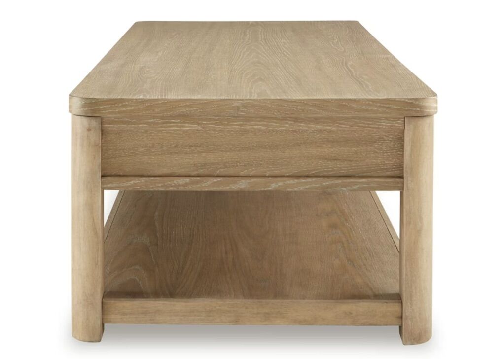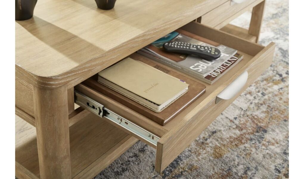 This coffee table's classic yet contemporary good looks are hard to deny. Softly shaped posts with a light oak finish and wire-brushed wood grain texture lend an organic appeal to your soothing space. Roomy drawers cater to additional storage needs while keeping clutter at bay. Plus there's plenty of display space on the lower shelf for, ahem, coffee table books.