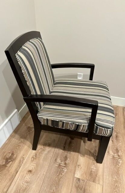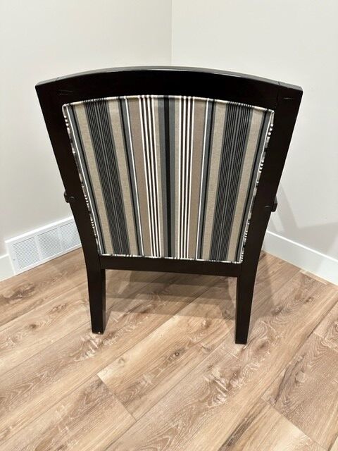 The chair is very sturdy with strong wood arms. The arms/frame is black. The stripes are a mix of white, cream, teal, brown, and black.