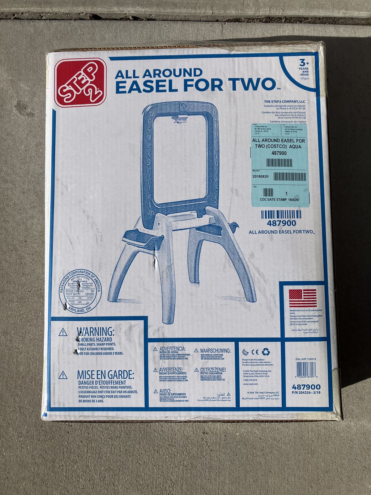 We purchased this art easel for our kids when they were younger, but it was never even opened. It has a whiteboard on one side and a chalkboard on the other side. It stands just over 40" and the box states for ages 3+.