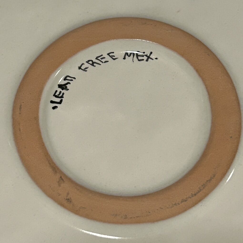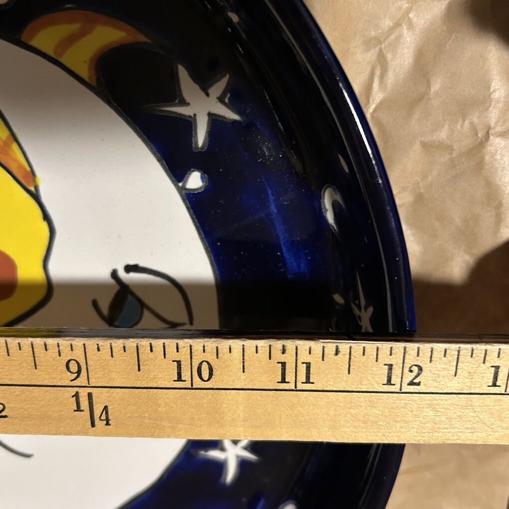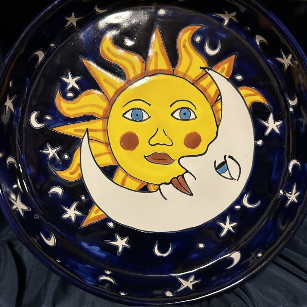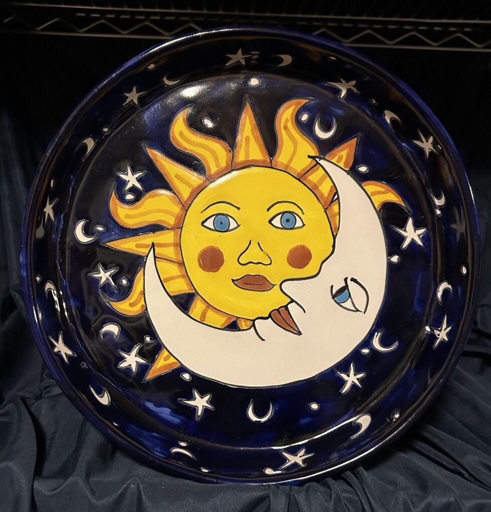 Hand-crafted in Mexico Serving Dish features a hand painted Sun and crescent moon on a night sky with stars in the background. Colors are amazingly bright and vibrant. This bowl made in Mexico and is labeled “Lead Free Mex.” Not as intricate as most Talavera pottery, but this could be from that area of Mexico. This pottery platter (with 2 inch tall sides) has an 11” base and is 12” across at the rim. This platter is in pristine condition with no chips, cracks, scratches, or defects. Photographs are of the exact item you are buying. Delivery available to a convenient location when in your area for $5.00