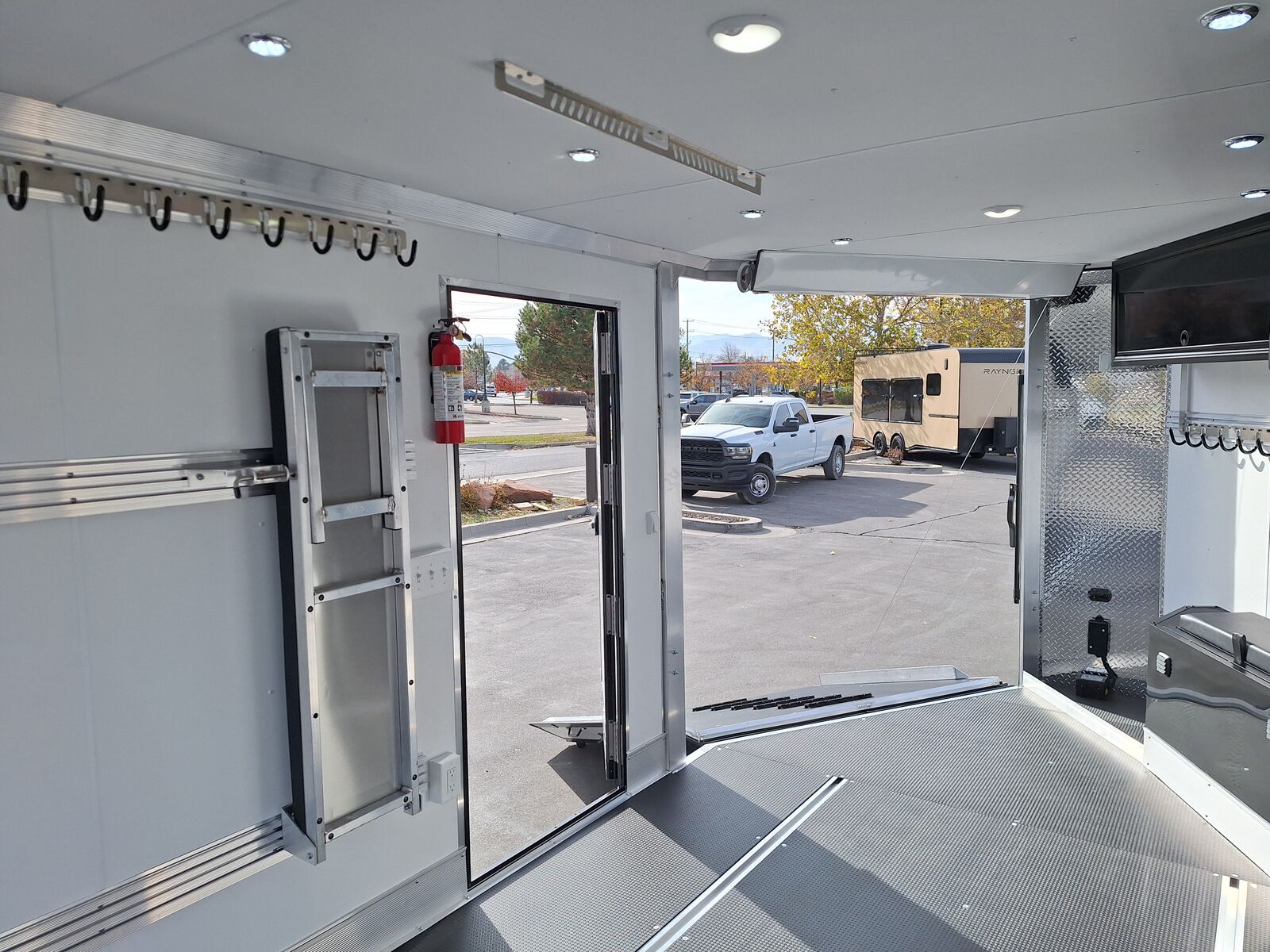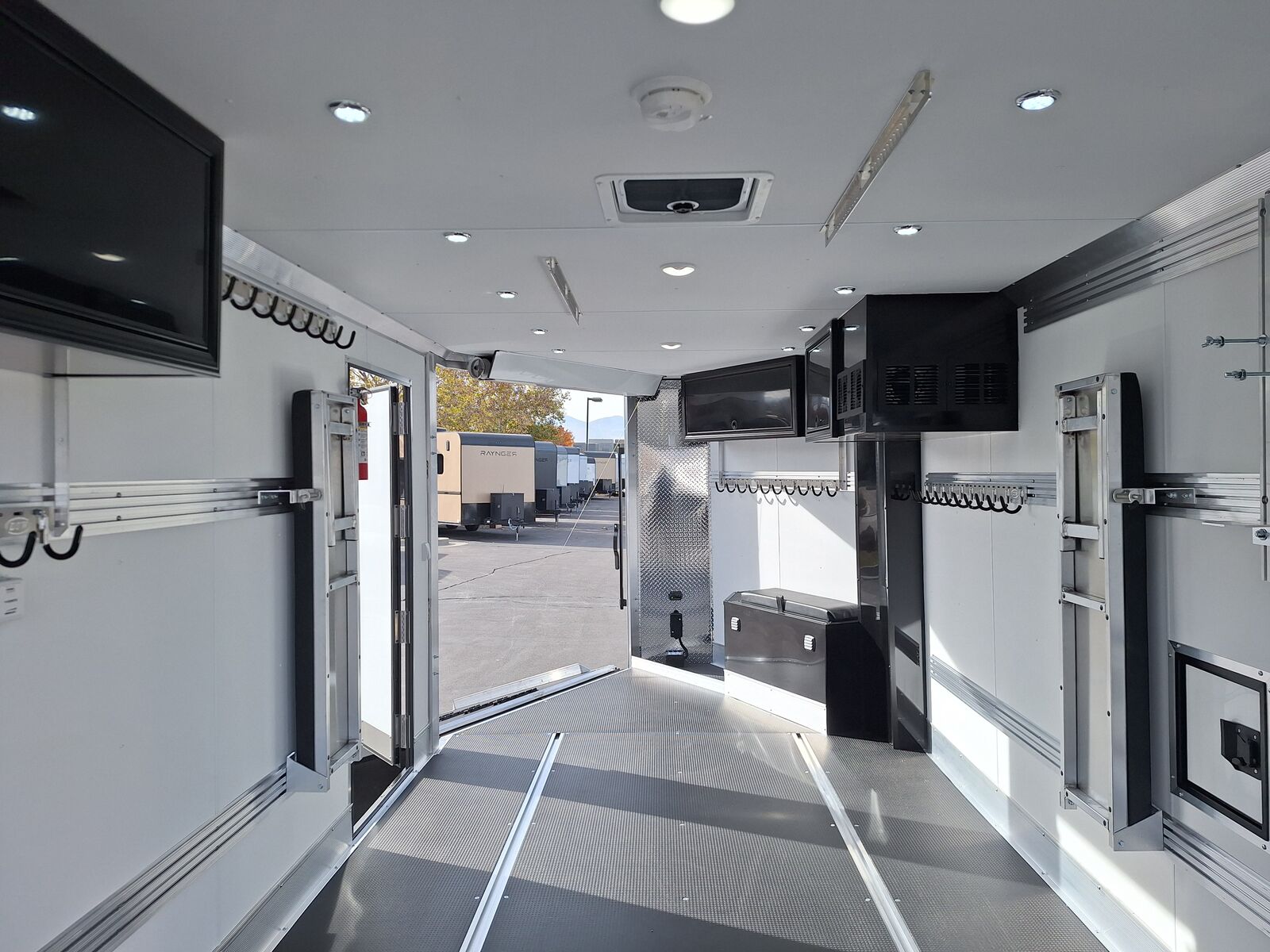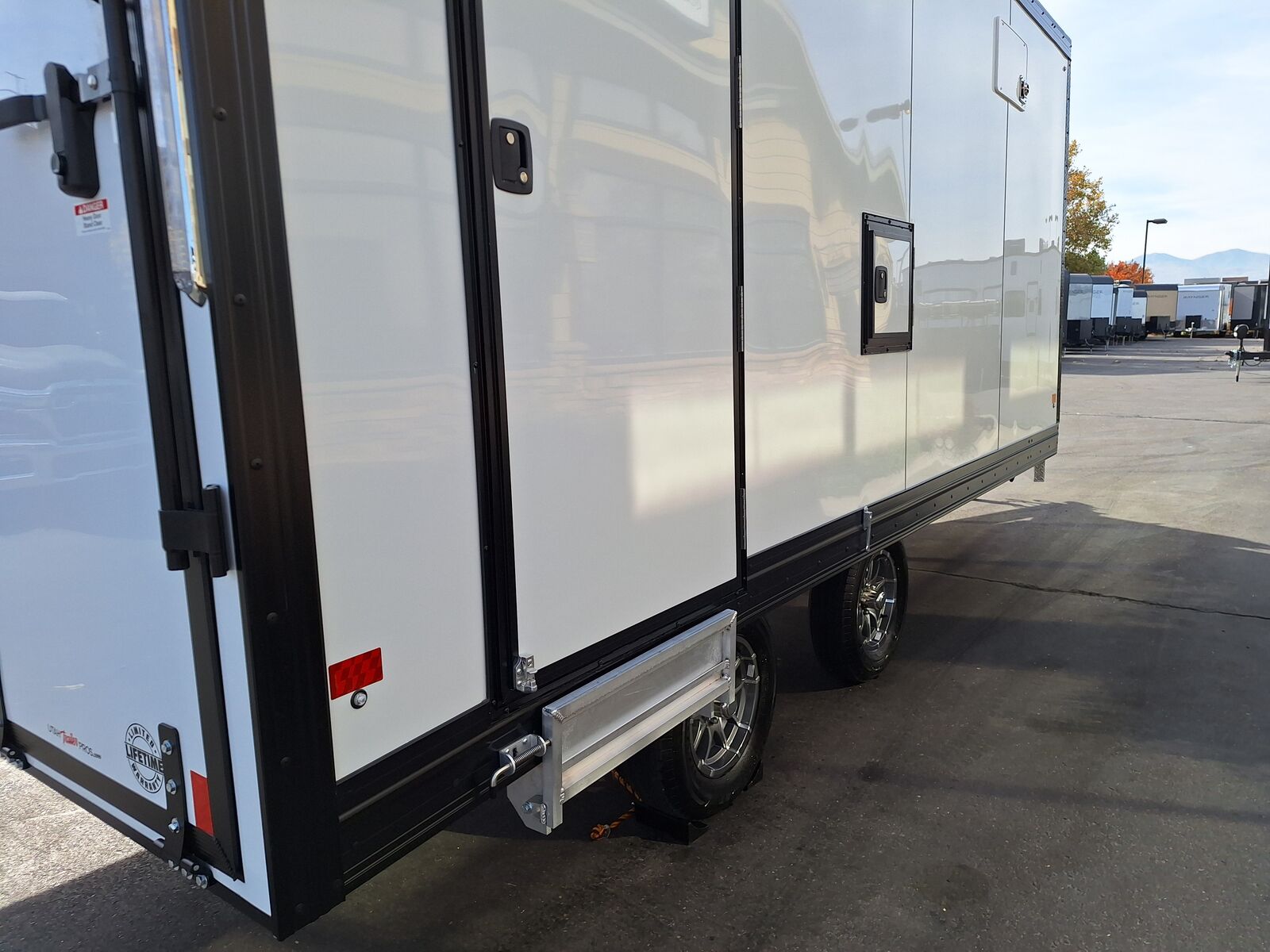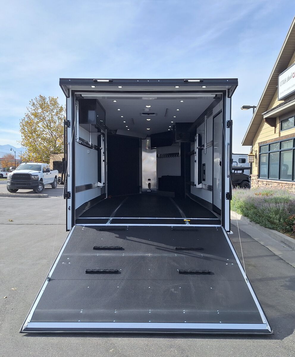 All-Aluminum Construction One-Piece Aluminum Roof Visible Beavertail Construction V-Nose Construction w/12" Radius 24" Stone Guard Dexter Torsion Ride Axles (45 Degree Down) Spread Axle Design w/Tapered Skirting (2) Rows of Recessed Slide Track w/(2) Rows Sliding D-Ring per Machine Tapered Rear Ramp Door w/Spring Assist (2) 32”x72” Side Access Door w/Flip Down Aluminum Step (1) 14”x14” Fuel Door(s) Roof Vent (3) LED Dome Lights w/Switch (5) LED Porch Lights: (2) Over Rear Ramp, (1) Over Each SAD & (1) Over Front Ramp 110V Extreme Weather Package: (1) 60A Breaker Panel w/Converter and Motorbase Plug, (2) 3-Way Wall Switches, (1) GFCI Wall Receptacle, (1) Standard Wall Receptacle, (1) USB Receptacle, (12) Puck Lights Premium Exterior Light Package (Integrated Slim Brake and Backup Lights & Clear Lens Marker Lights) Premium Heater Package: 40# Propane Tank w/ HD Tongue-Mount, White Ceiling, Insulated Walls & Ceiling, 40K BTU Furnace, Safety Kit, Marine Grade Battery & Box, 48" Furnace Cabinet (1) 40# Propane Tank w/HD Mount Upgrade 3/4" Quad-Ply Decking White Luan Walls Boondocker Package: Upgrade to QuadPly Flooring, Wraparound Front Ramp w/ Spring Assist (72" Wide Opening) & 6" Extruded Aluminum Kick Plate (2) Fold-Down Padded Bench (48”L) 48" Deluxe Boot Box w/Padded Top & Duct (Requires Furnace Pkg) Vertical Corner Duct (Requires Furnace Package) (2) 48" Premium Overhead Cabinets w/ (1) Flip-Up Door; 48"(W) x 13"(D) x 18"(H) (2) Premium Ceiling-Mounted Coat Hangers (38”, 22 Hooks) Adjustable Wall Hooks For Combo Wall (2 Hooks/18’; 4 Hooks/22’+ BP; 4 Hooks/GN) Combo Wall (3 Rows in Box, 2 Rows in V-Nose) Angled Brackets (Convert Cabinets to Combo Wall) Deluxe Floor Drain System (Full Width Slot, Exterior Clean Out) Rear Door Canopy (2020 Version w/4 Puck Lights) Screwless .030" Bonded Sides Powdercoat Exterior Package 4” Trim (Top/Rear) 7” Trim (Bottom) Limited Lifetime Warranty