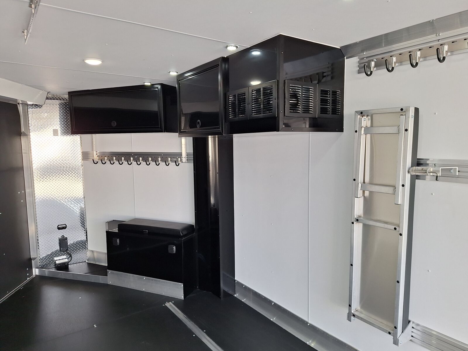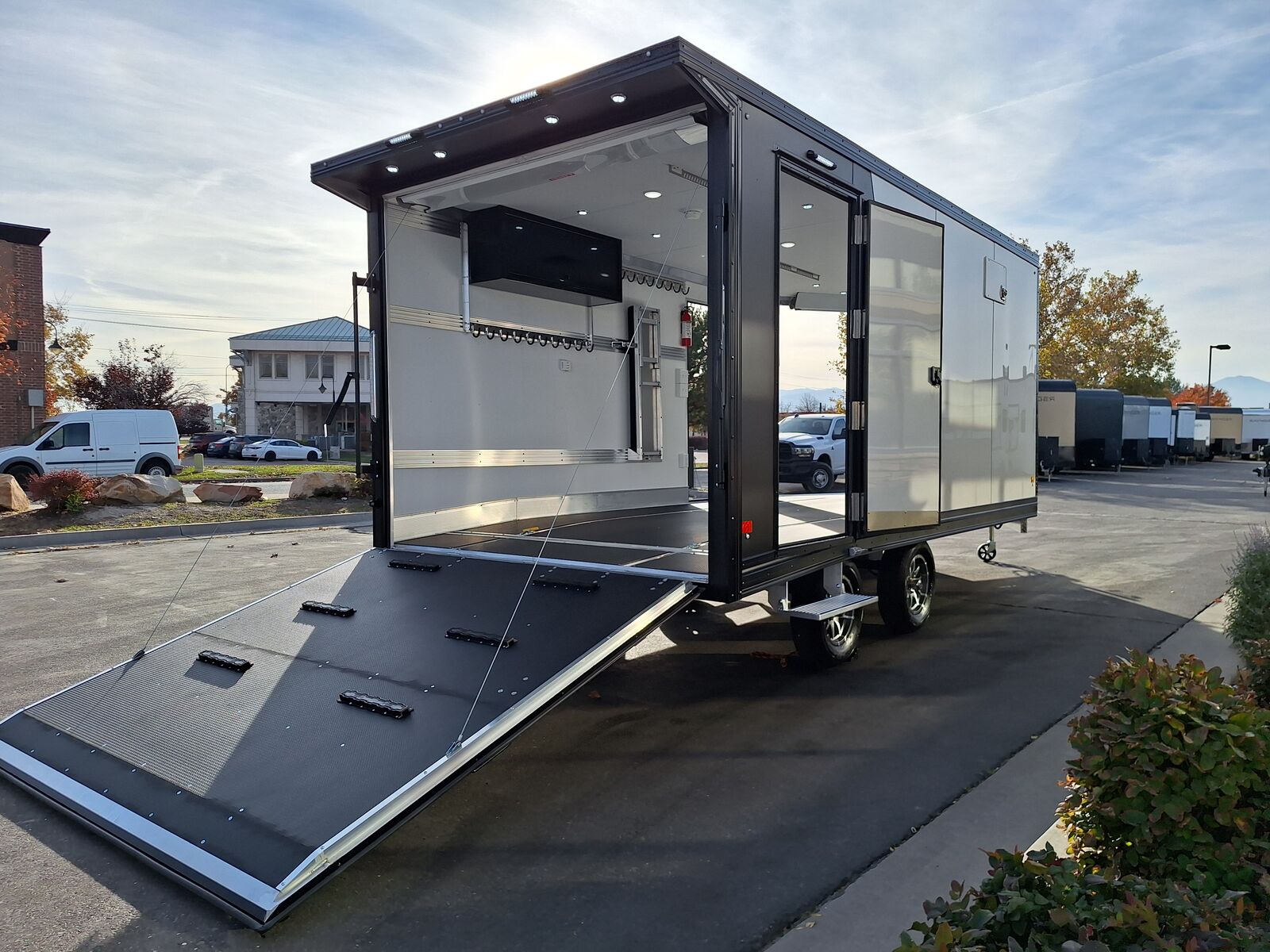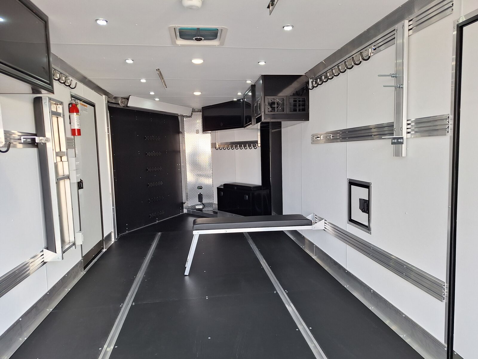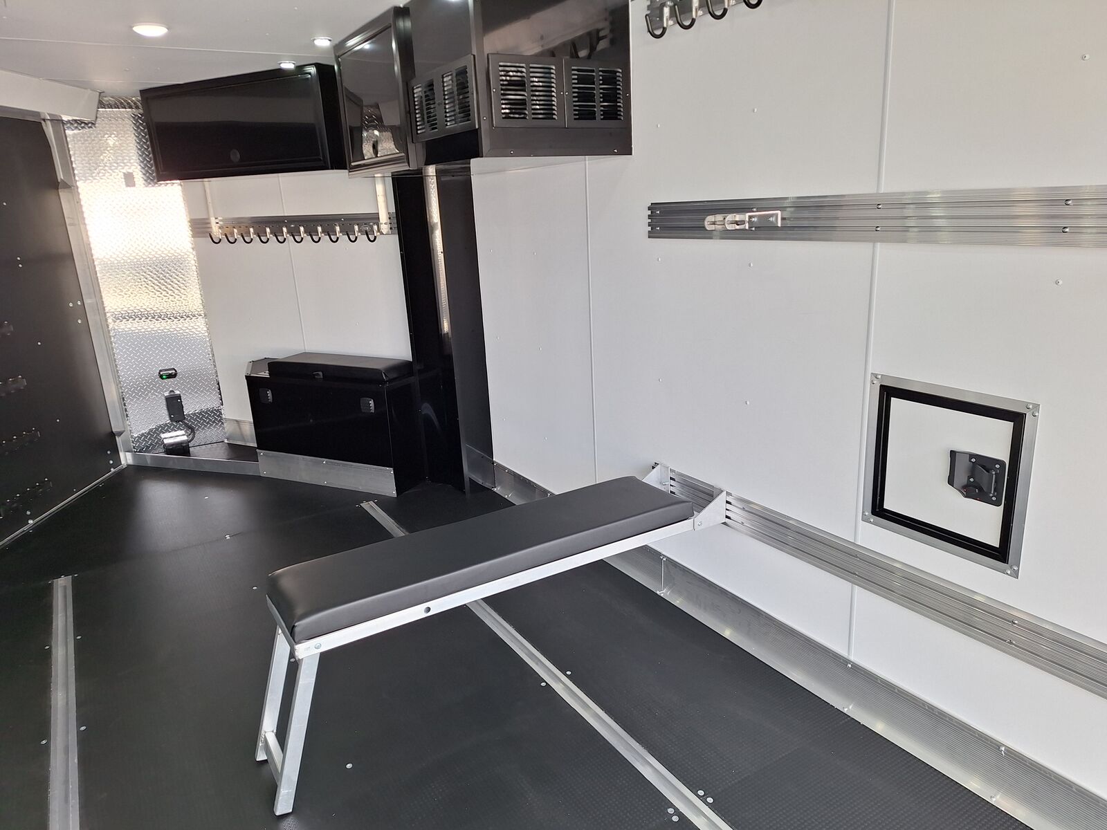 All-Aluminum Construction One-Piece Aluminum Roof Visible Beavertail Construction V-Nose Construction w/12" Radius 24" Stone Guard Dexter Torsion Ride Axles (45 Degree Down) Spread Axle Design w/Tapered Skirting (2) Rows of Recessed Slide Track w/(2) Rows Sliding D-Ring per Machine Tapered Rear Ramp Door w/Spring Assist (2) 32”x72” Side Access Door w/Flip Down Aluminum Step (1) 14”x14” Fuel Door(s) Roof Vent (3) LED Dome Lights w/Switch (5) LED Porch Lights: (2) Over Rear Ramp, (1) Over Each SAD & (1) Over Front Ramp 110V Extreme Weather Package: (1) 60A Breaker Panel w/Converter and Motorbase Plug, (2) 3-Way Wall Switches, (1) GFCI Wall Receptacle, (1) Standard Wall Receptacle, (1) USB Receptacle, (12) Puck Lights Premium Exterior Light Package (Integrated Slim Brake and Backup Lights & Clear Lens Marker Lights) Premium Heater Package: 40# Propane Tank w/ HD Tongue-Mount, White Ceiling, Insulated Walls & Ceiling, 40K BTU Furnace, Safety Kit, Marine Grade Battery & Box, 48" Furnace Cabinet (1) 40# Propane Tank w/HD Mount Upgrade 3/4" Quad-Ply Decking White Luan Walls Boondocker Package: Upgrade to QuadPly Flooring, Wraparound Front Ramp w/ Spring Assist (72" Wide Opening) & 6" Extruded Aluminum Kick Plate (2) Fold-Down Padded Bench (48”L) 48" Deluxe Boot Box w/Padded Top & Duct (Requires Furnace Pkg) Vertical Corner Duct (Requires Furnace Package) (2) 48" Premium Overhead Cabinets w/ (1) Flip-Up Door; 48"(W) x 13"(D) x 18"(H) (2) Premium Ceiling-Mounted Coat Hangers (38”, 22 Hooks) Adjustable Wall Hooks For Combo Wall (2 Hooks/18’; 4 Hooks/22’+ BP; 4 Hooks/GN) Combo Wall (3 Rows in Box, 2 Rows in V-Nose) Angled Brackets (Convert Cabinets to Combo Wall) Deluxe Floor Drain System (Full Width Slot, Exterior Clean Out) Rear Door Canopy (2020 Version w/4 Puck Lights) Screwless .030" Bonded Sides Powdercoat Exterior Package 4” Trim (Top/Rear) 7” Trim (Bottom) Limited Lifetime Warranty
