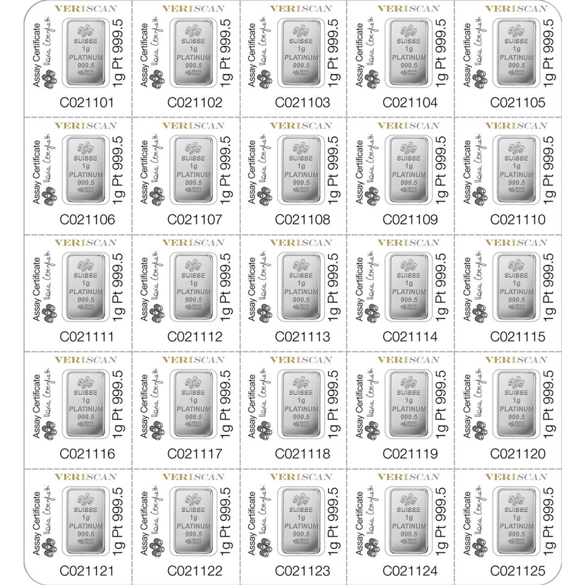 Pamp Suisse Mint 25 gram multigram Platinum bars. Straight from the mint, BU (Brilliant Uncirculated), Never opned, never pre-owned.