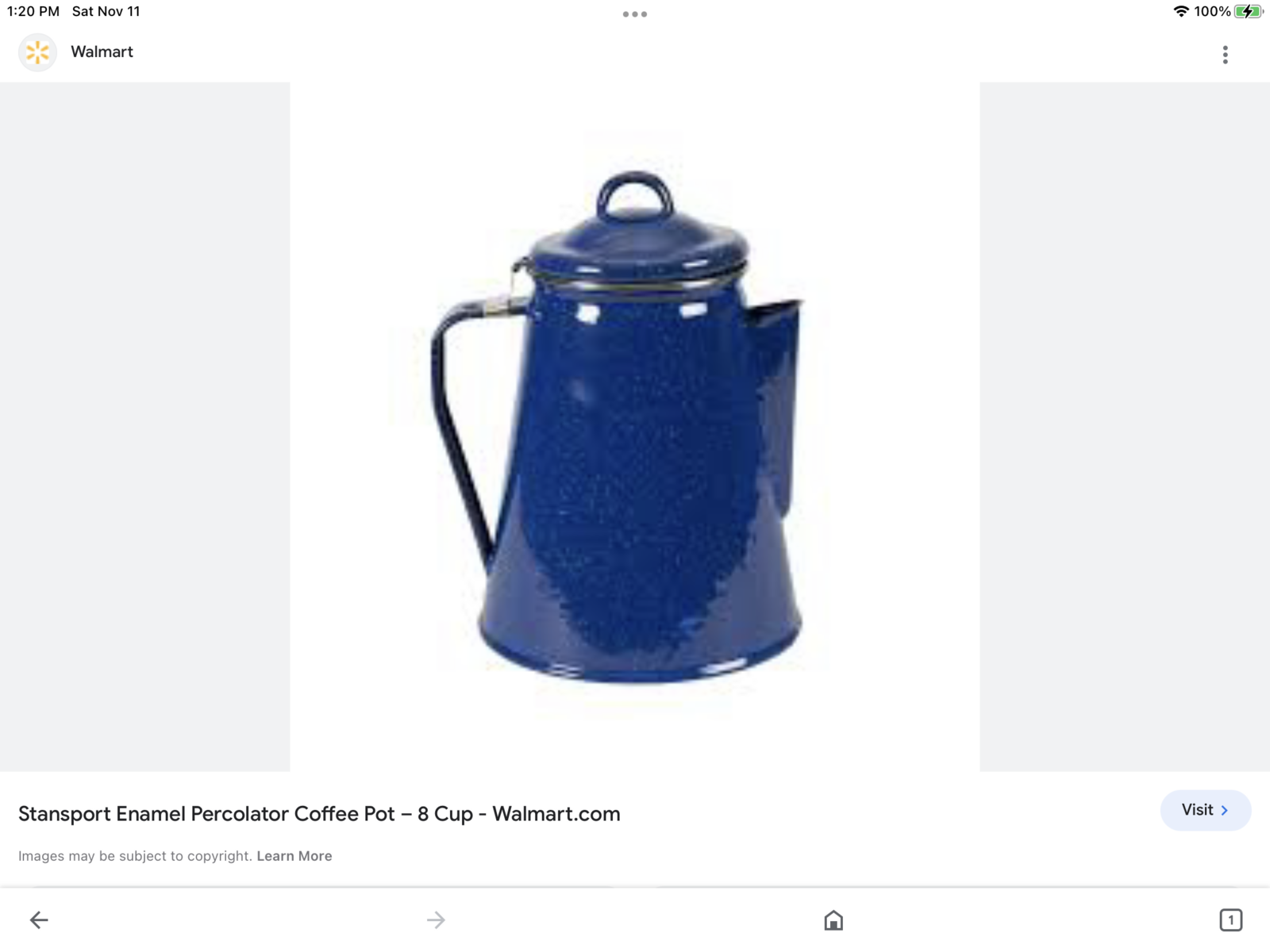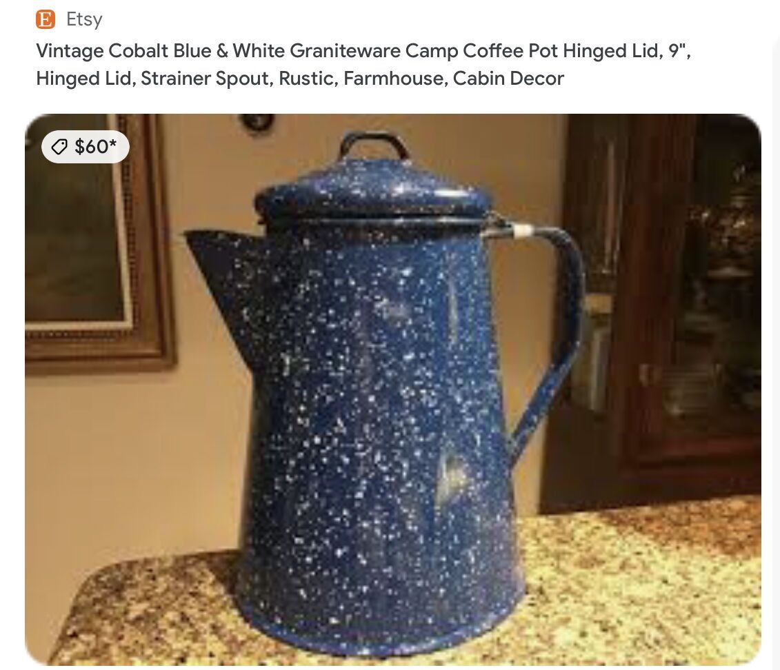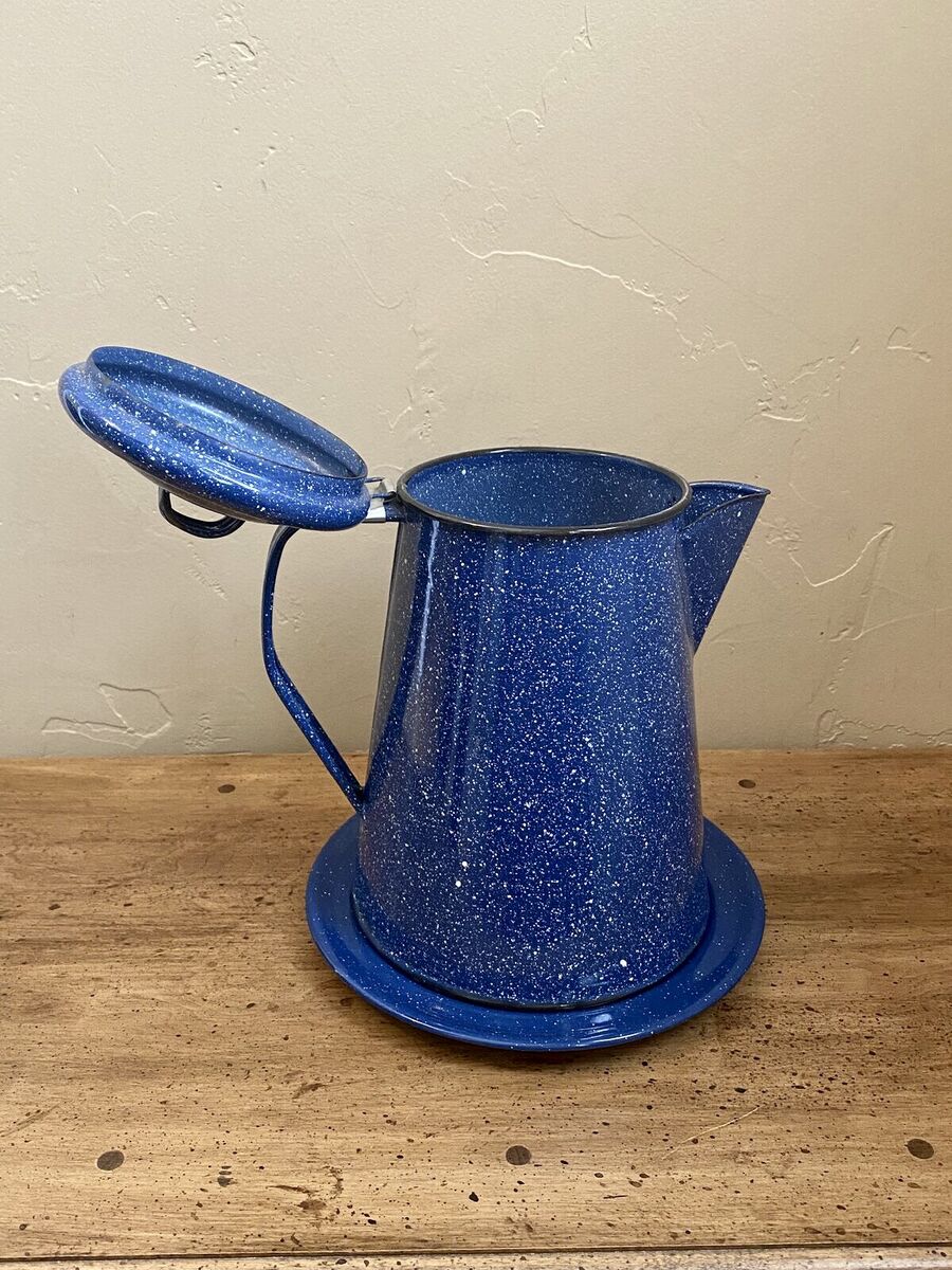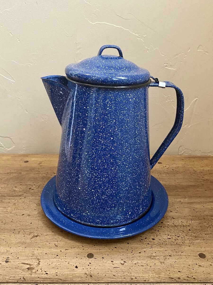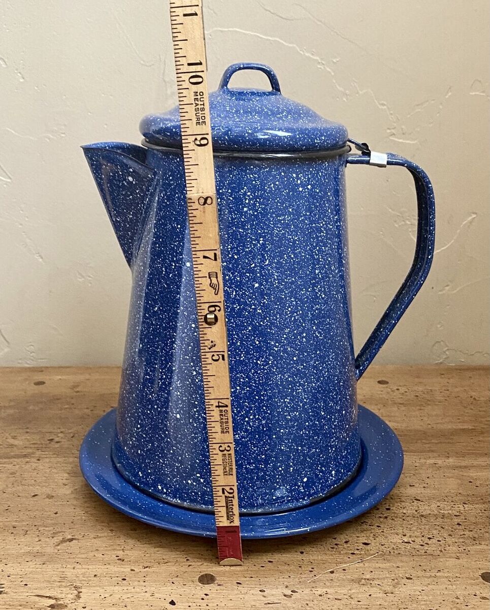 Stansport 8 Cup Blue Enamel Percolator Coffee Pot W/ Matching Enamel Plate - Blue Speckle - C PIX. I imagine this as decor but could possibly be used for camping if the rust was cleaned out. I just used it as decoration. There's another one used selling for $60 in not great shape without the plate.