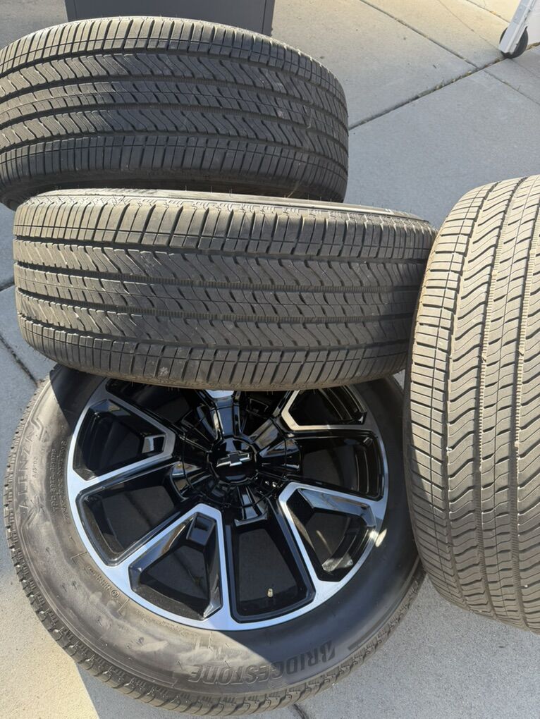 22” wheels and tires, come off 2025 chevy tahoe, not Tpms sensors , lug nuts included.