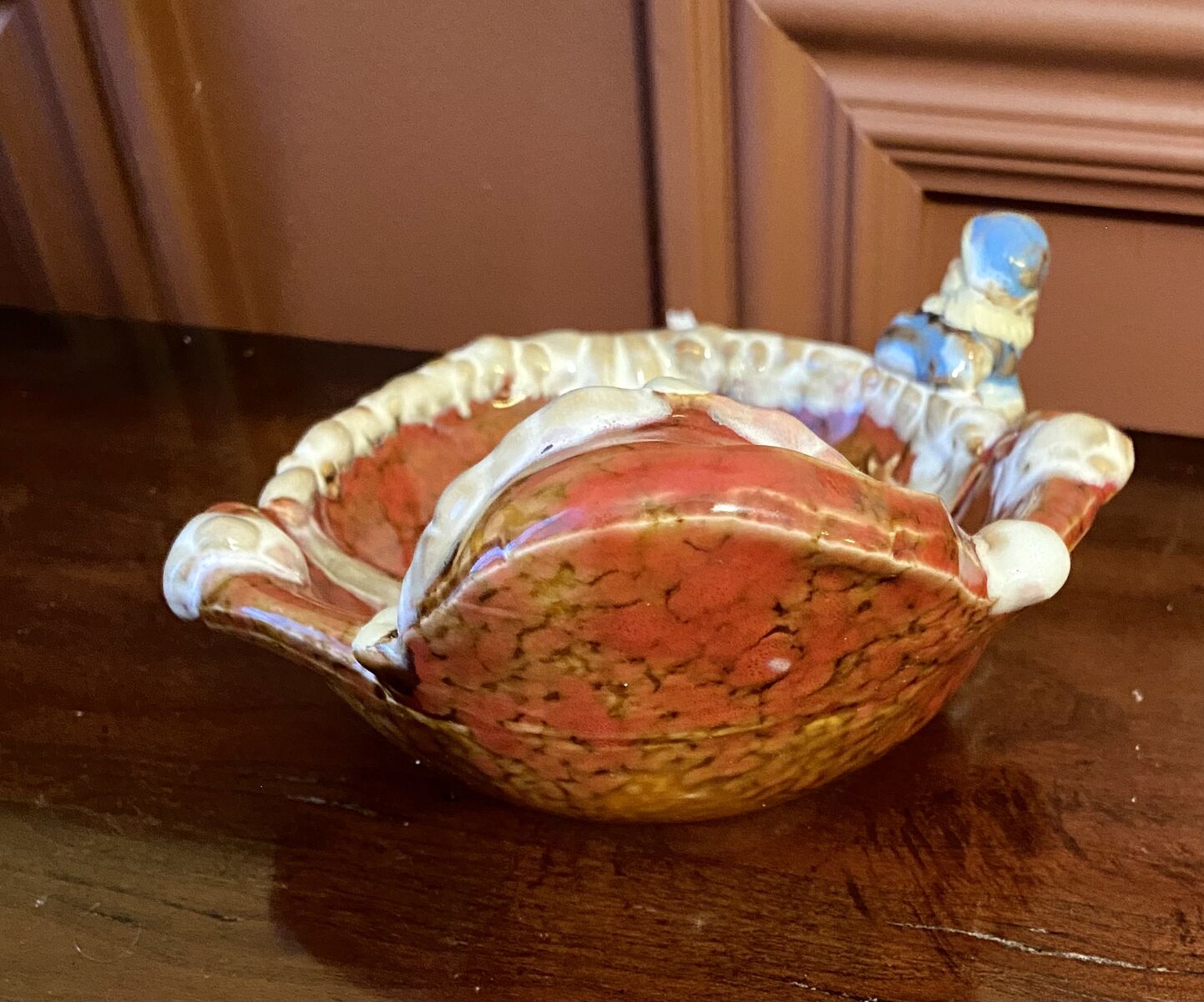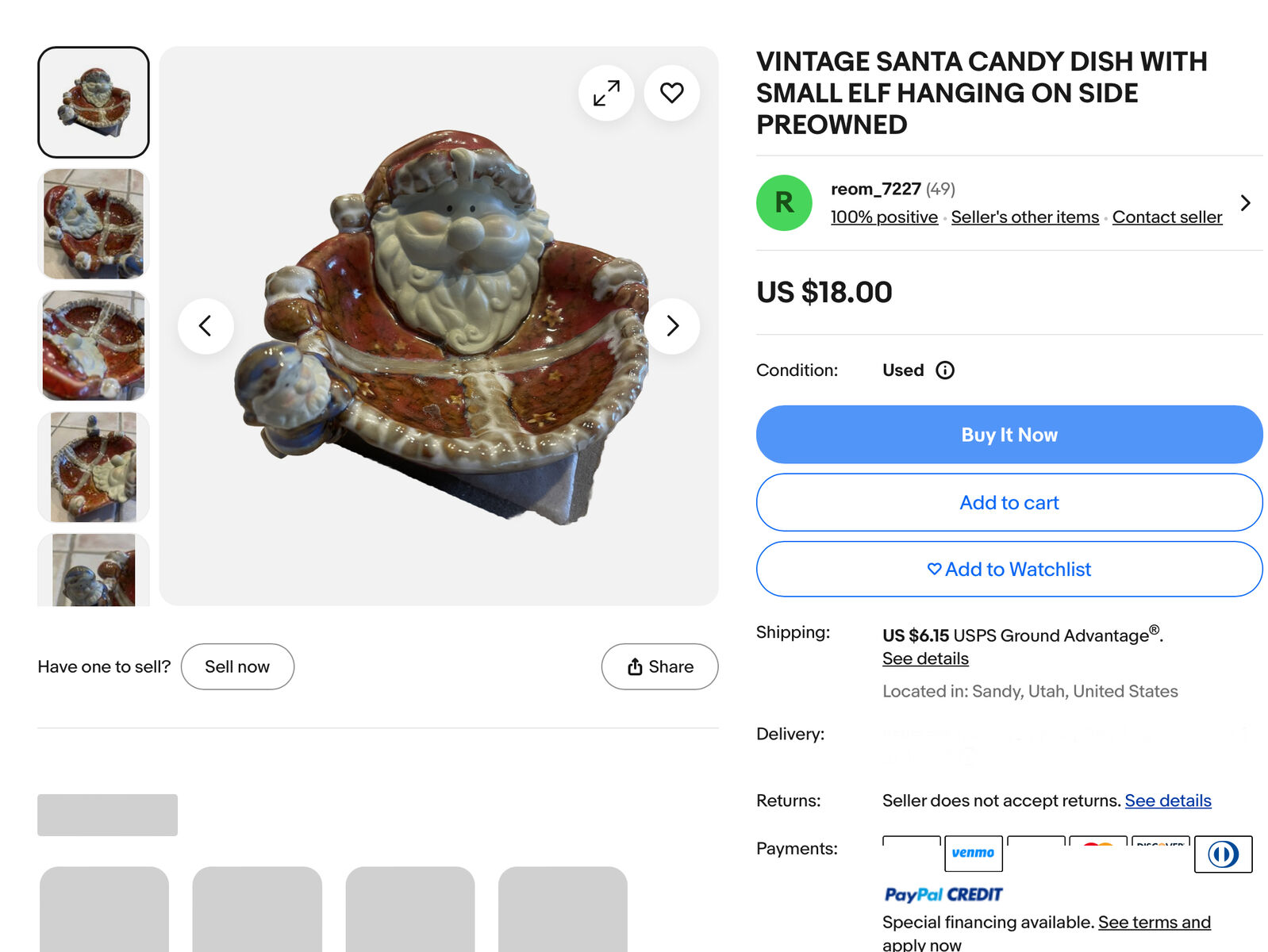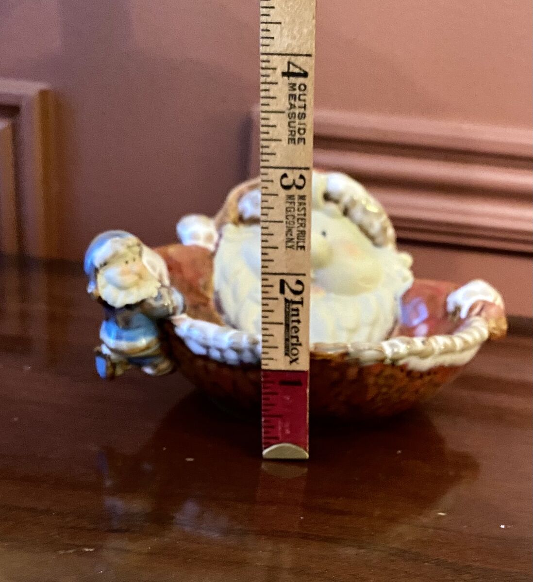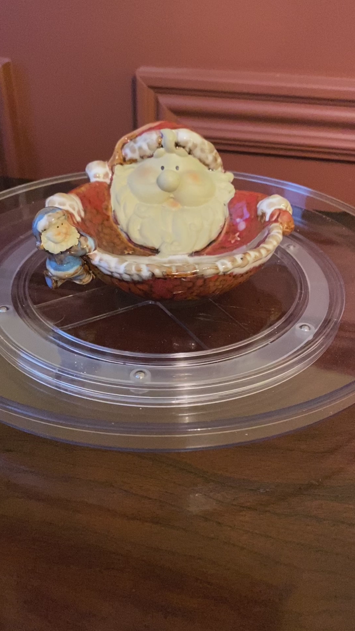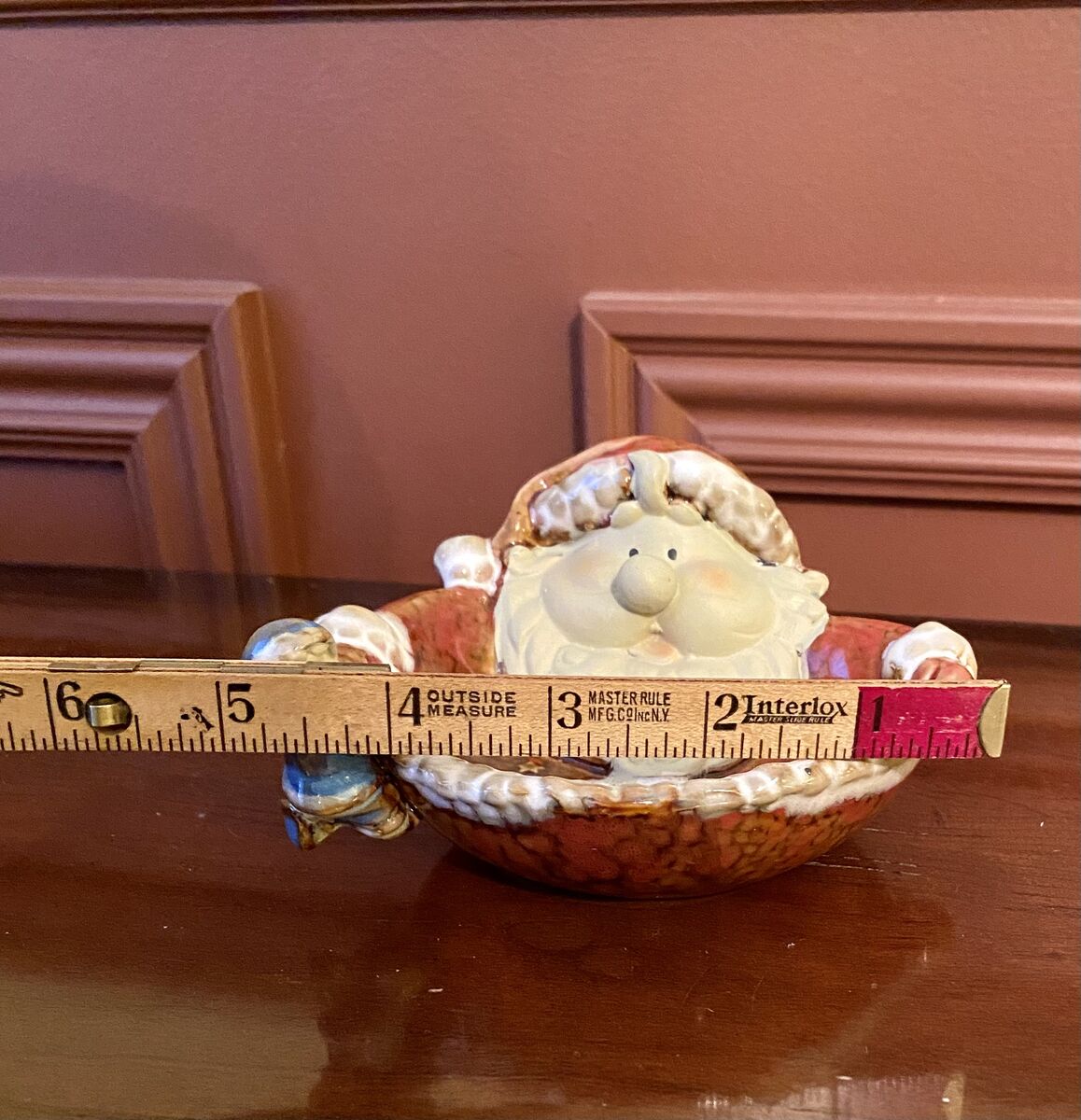 Vintage Ceramic Santa Candy/Trinket Dish With Small Elf Hanging On The Side - C PIX. This dish has so many cute details. Great Condition. This same piece is sold elsewhere for $18. I also have a great snowman bowl.