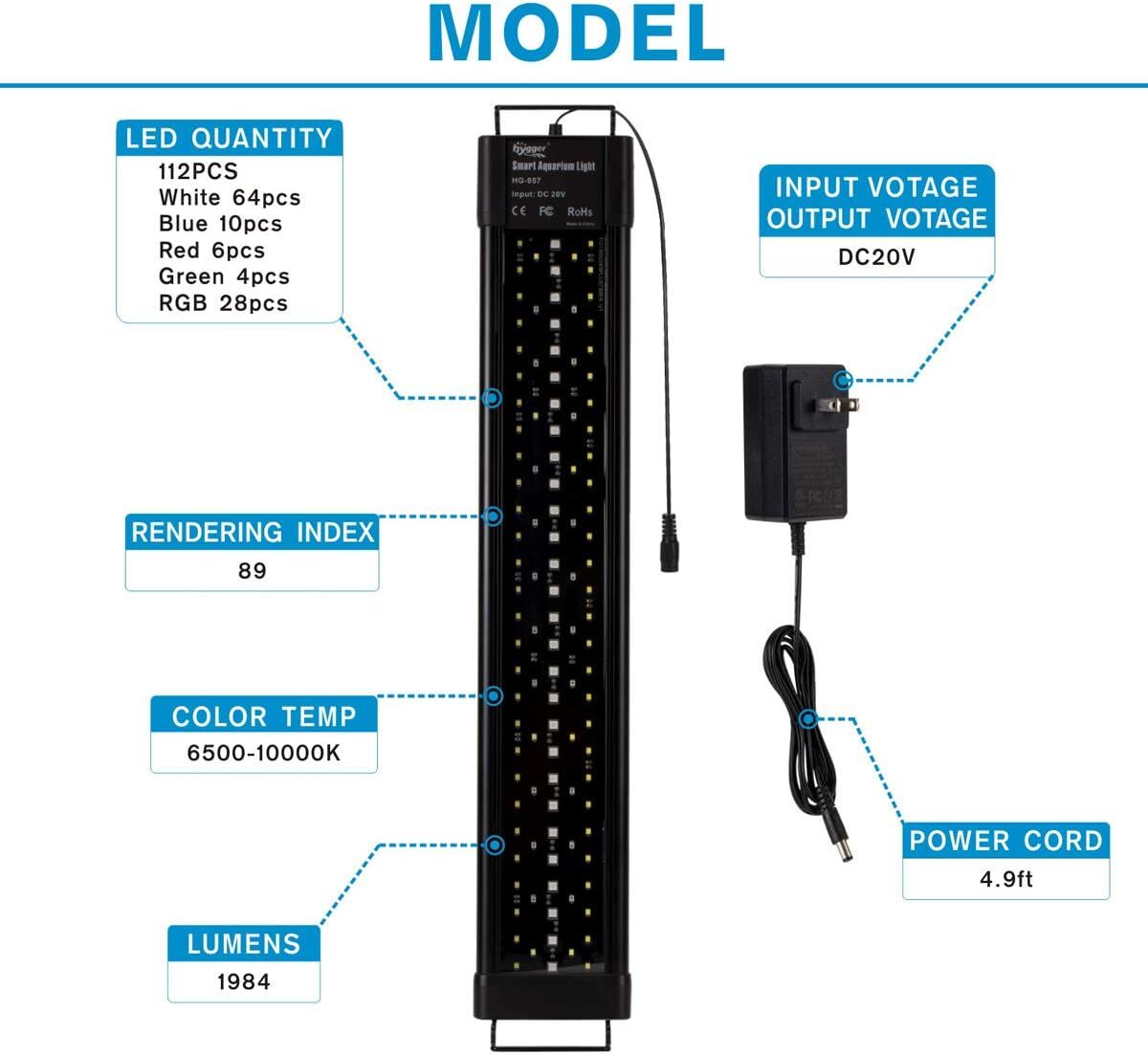 4 Modes: Default Mode. L: All-optical + Blue light(can change); Brightness is simulated sunrise to sunset + night effect. DIY Mode. L1-L6: All-optical; L7-L8:Blue. The brightness(10 kinds) and time (any time) of each stage(8 stages in total) can be set by yourself. Gradient Mode. The brightness time cannot be set. Cycle colors-dark blue, green, purple, light blue, yellow, red. All-day All-optical Mode.Can fine-tune the color temperature of RGB light, can not set the brightness and time New Upgrade: Lamp beads IP68 waterproof, and easy to clean and wipe. The separable adapter, even if it is damaged, no need to replace the light to avoid waste. Power off memory function, after the power is restored, the local time of the light will default to 12 noon, other settings remain unchanged, and then continue to run. The extendable bending bracket can be adjusted in length and easy to install, and can be applied to various freshwater tanks Useful Fish Light: the color of the fish tank light is all-optical, dark blue, green, purple, light blue, yellow, red, dark red (sign of the start color cycle mode). The light is soft, the color rendering index is close to natural light, up to 89%, protecting eyes and fish, to refuse the discomfort caused by stroboscopic for fish and viewers. Using high-quality 2835 + 5050 model lamp beads, long service life, at least 50,000 hours. And there are 10 kinds of light brightness can be adjusted LCD Display Operation: There are four function keys, mode setting / up / down / light setting keys. The main screen mainly displays the real-time local time (optional 12 hours/24 hours), the time is accurate to the second. The following two small screens are program timers, which used to set the start and end time of day and night in mode Technical Specifications: Aluminum alloy plastic case. LIGHT SIZE:60_10_2.2 cm. APPLICATION: 24~30 inches. INPUT VOTAGE: AC100-240V. OUTPUT VOTAGE:DC15V. LED QUANTITY:112 PCS. RENDERING INDEX:89. LUMENS:1984. Color temp:6500-10000K. POWER CORD:4.9 ft 11-18-25 SLC-122312 00.6 rt54