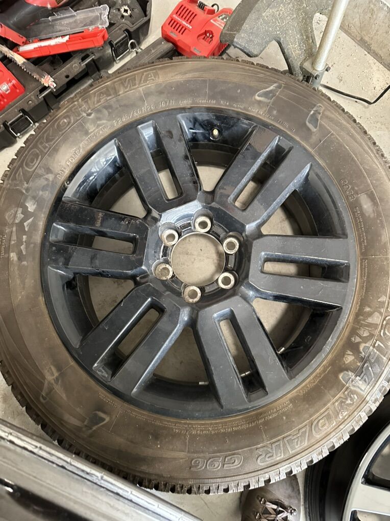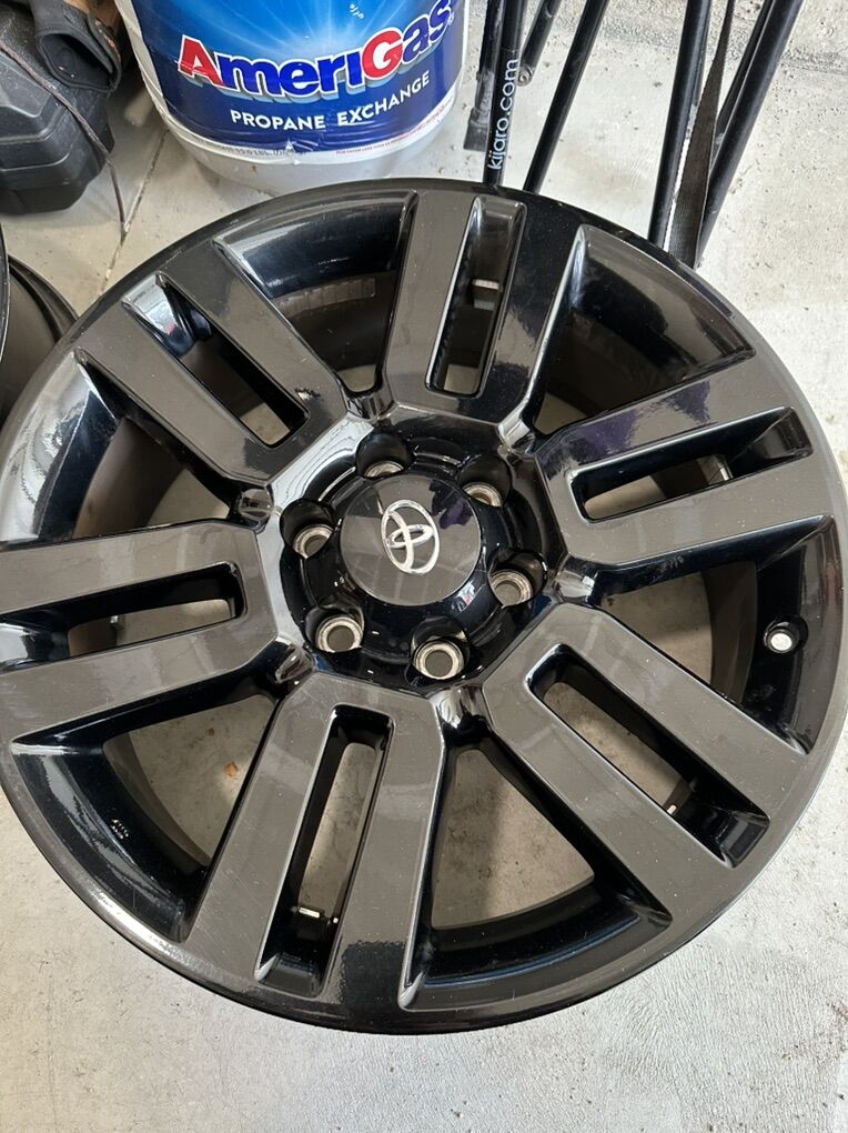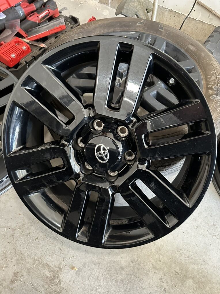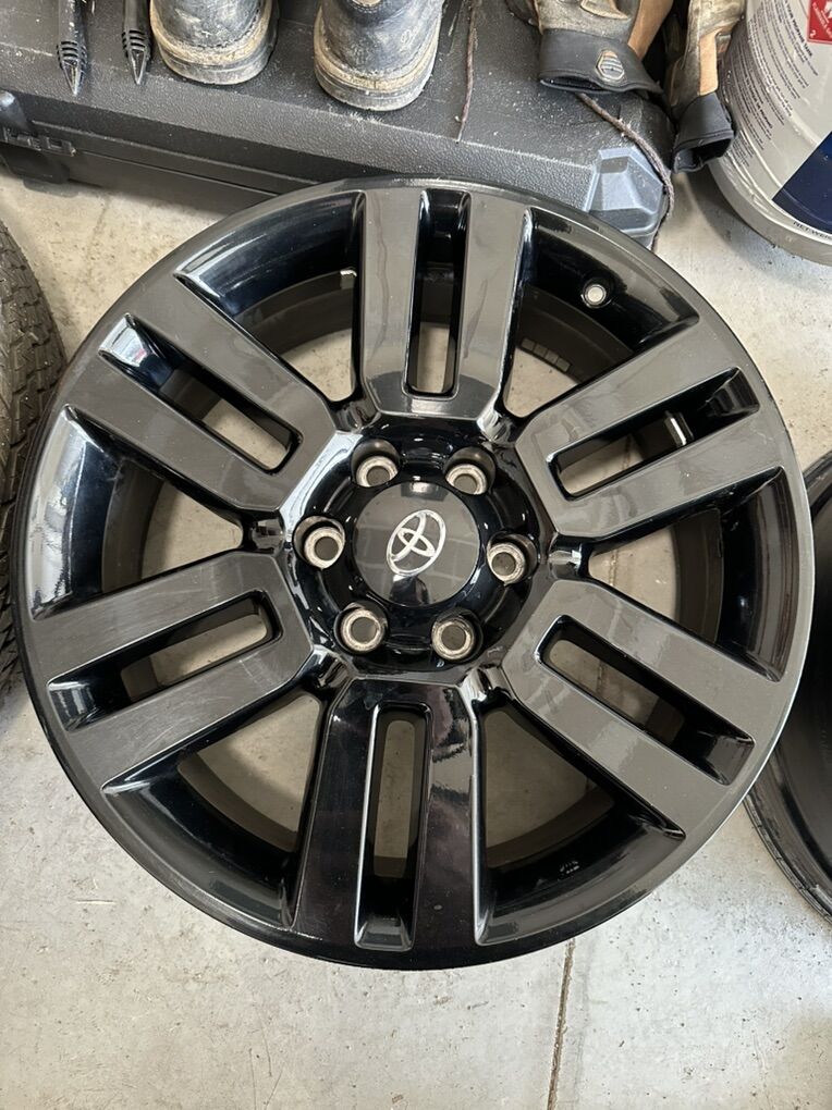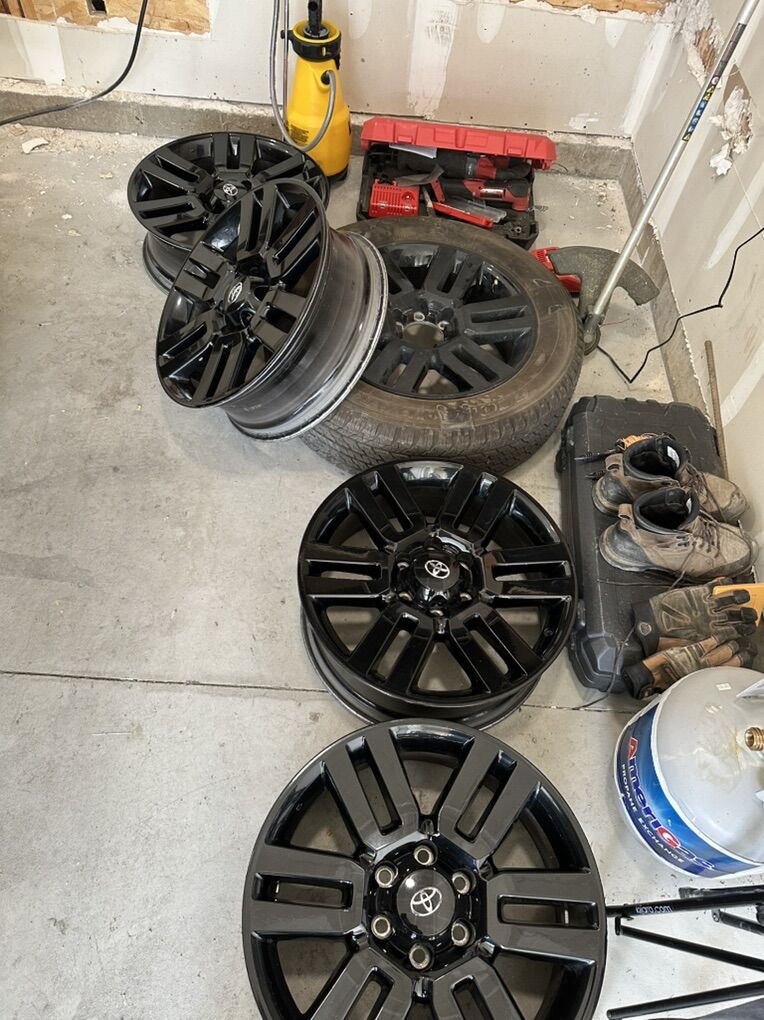 These came off a limited toyota 4runner nightshade edition. Factory black paint, spare has the original tire that was on it. Check photo for tire size. Rims will fit any toyota 6 lug nut pattern
