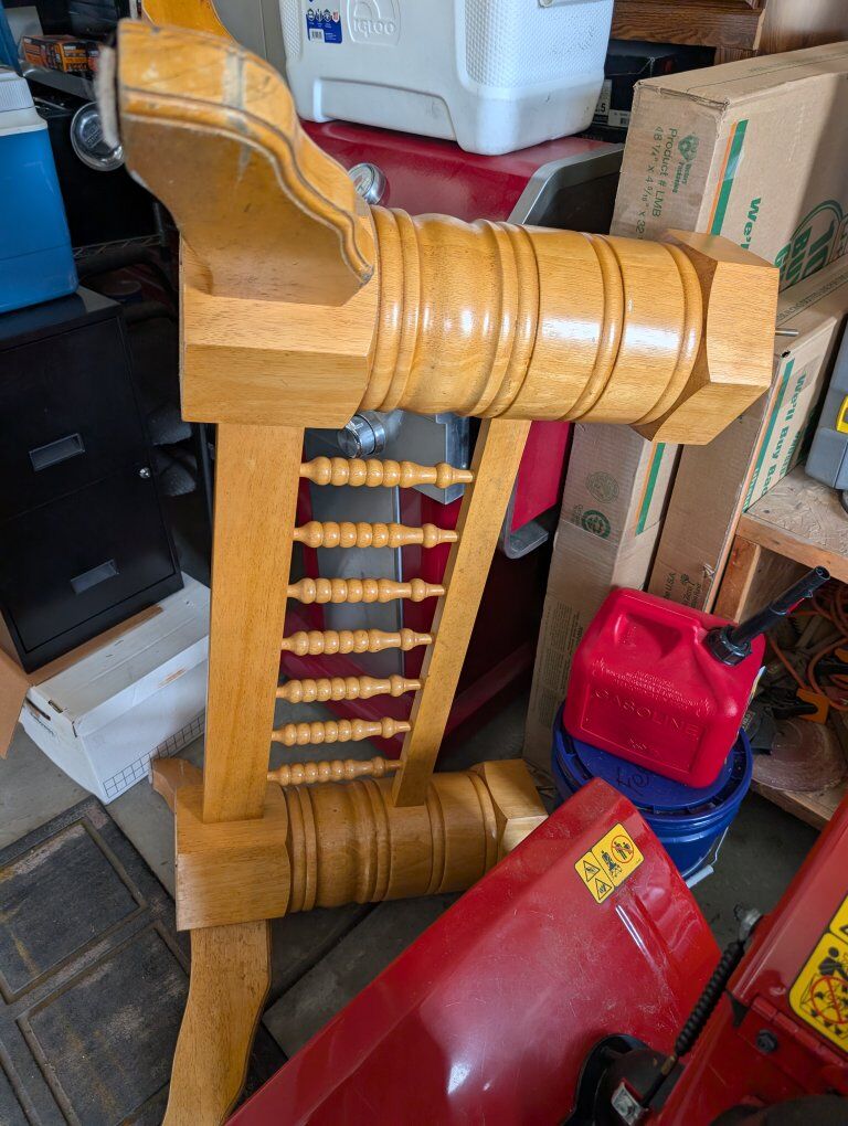 VenmoPine table with 6 chairs. no structural problems. Some light blemishes on surface. Just 4 nuts to reattach base to table top. I had to be disassembled to move through doorway.