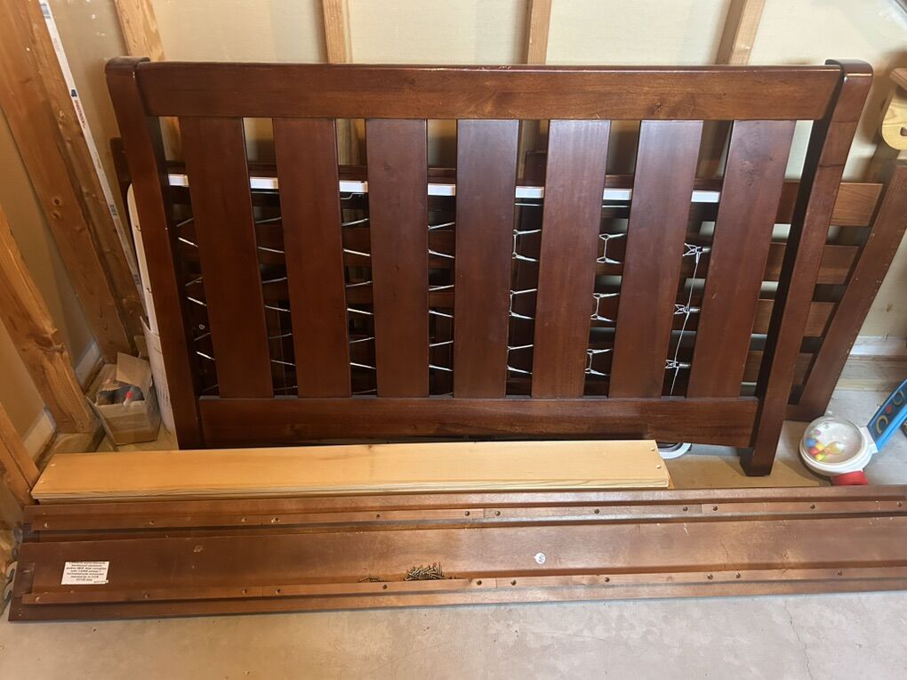 VenmoThis wood bed frame converts from a baby crib to a full bed size. Everything is included a from baby mattress, side rails, and spring box.
