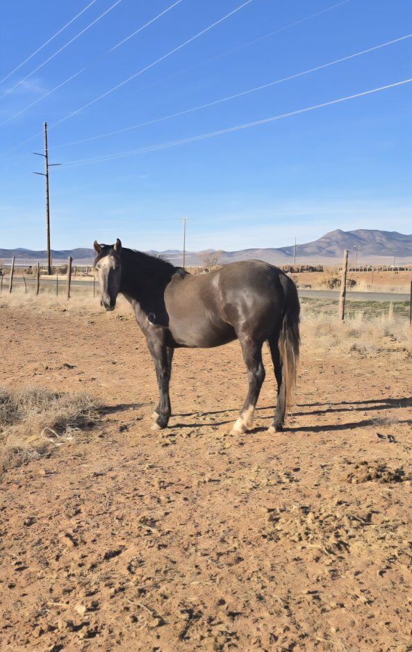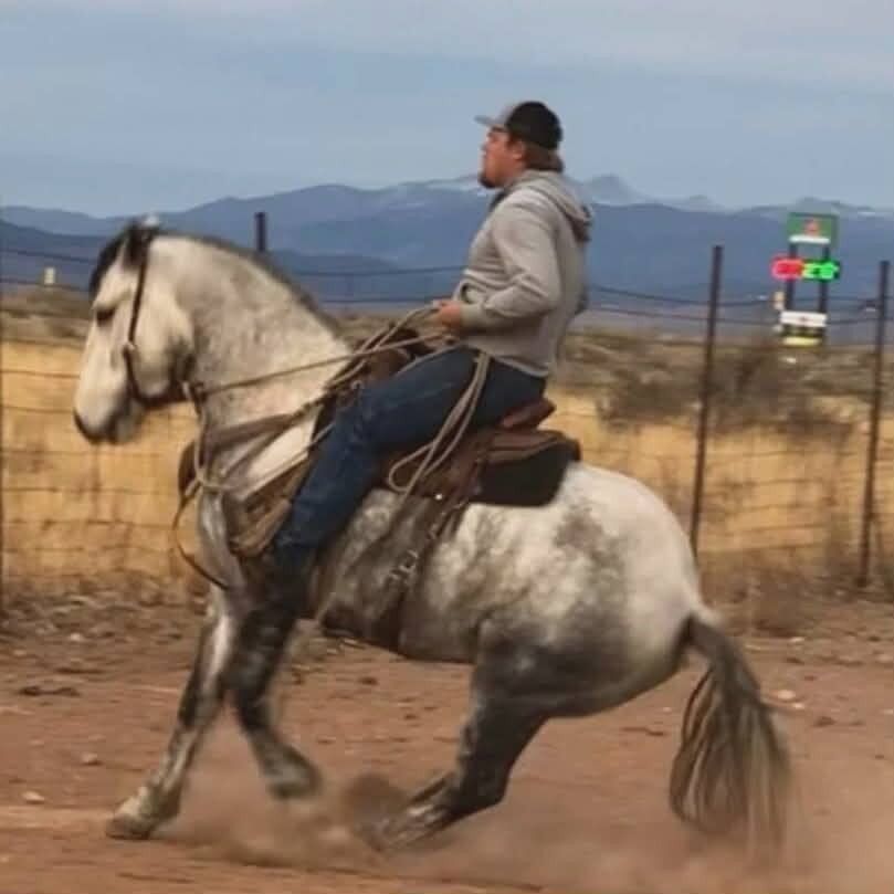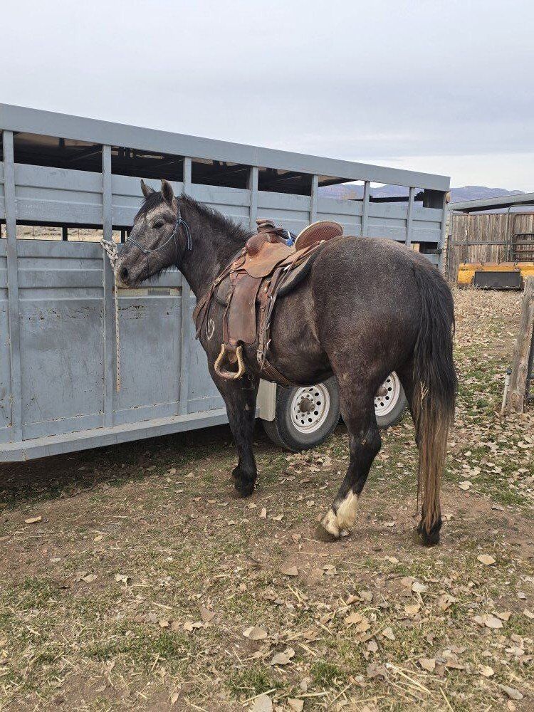 Maggie is a coming 3 yr old 1/2 draft filly. Has 30 rides on her. shes ready to go any directon you need her to. She travels out really nice smooth fast walk, lopes nice circles, loads and uploads great. Stands good to be saddled. Hasn't been shod, she has been trimmed regularly. She hadnt been rode all winter. We rode her the other day with no issues. The video was taken then. I just had her shod 2/8 1st set of shoes. stood good. Call for more information. The last pics are her sire, Doc is a 16'2hh sooty buckskin 1/2 draft, her dam is the grey 1/2 draft mare in the last 2 pics.