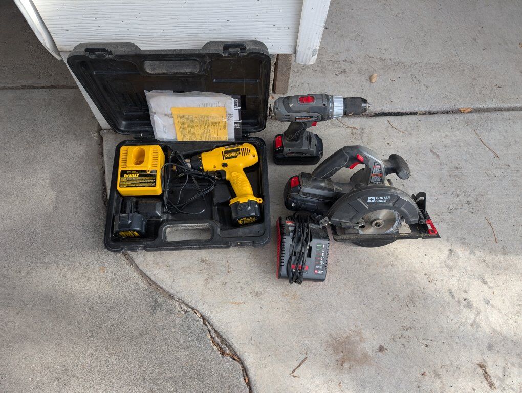 Got this old set of drills and a saw they work but aren't very powerful asking 50 obo for everything all together the DeWalt drill has 2 batteries