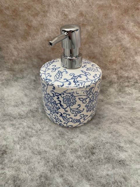 The FLORENCE soap/lotion dispenser is made of ceramic with a natural color base. It features a botanical print in blue tones.