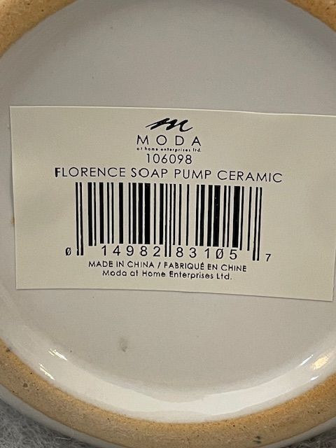 The Moda Florence Ceramic Soap Pump has a diameter of 4 inches (10 cm) and a height of 6 inches (15 cm).