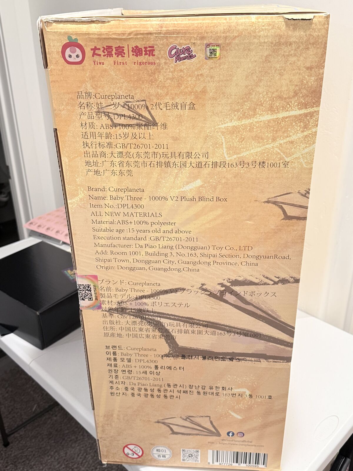 VenmoDescription Selling a Baby Three 1000% V2 giant plush from Cureplaneta – White Elephant design. Details: Official Baby Three – 1000% V2 big plush series Character: White Elephant (confirmed design) Extra‑large plush, about 22–26 tall Opened only to check the character – plush is still in the original inner plastic shell and has never been removed or displayed Outer box has some edge/corner wear from storage (see photos), but overall in good condition Smoke‑free home This is the same 1000% V2 series sold at designer toy/collectible shops for around $250 for a random blind box. Here you’re getting a guaranteed White Elephant without the gamble. Price: $75 OBO Pickup or Meetup. Cash or Venmo only. Payment & Pickup Policy For the safety and security of both parties, all transactions will be completed in person. Payment Method: Cash is preferred. If using Venmo, payment must be made and confirmed in person at the time of pickup. No Advance Payments: I do not accept advance payments or deposits to hold items. The item will remain available until a confirmed in-person transaction is completed. Pickup: We will arrange a mutually agreeable public meeting location for pickup. Thank you for your understanding.