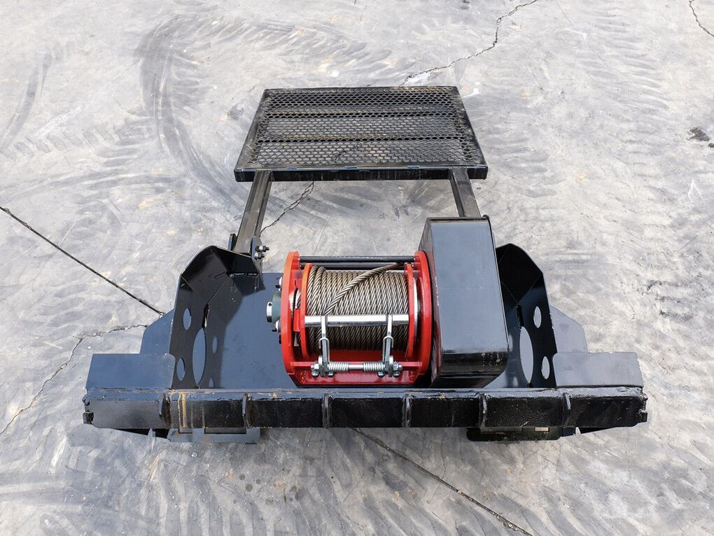 Heavy-duty skid steer logging winch designed for pulling logs, dragging timber, land clearing, and forestry work. Built for mini and full-size skid steers with compatible hydraulic flow.