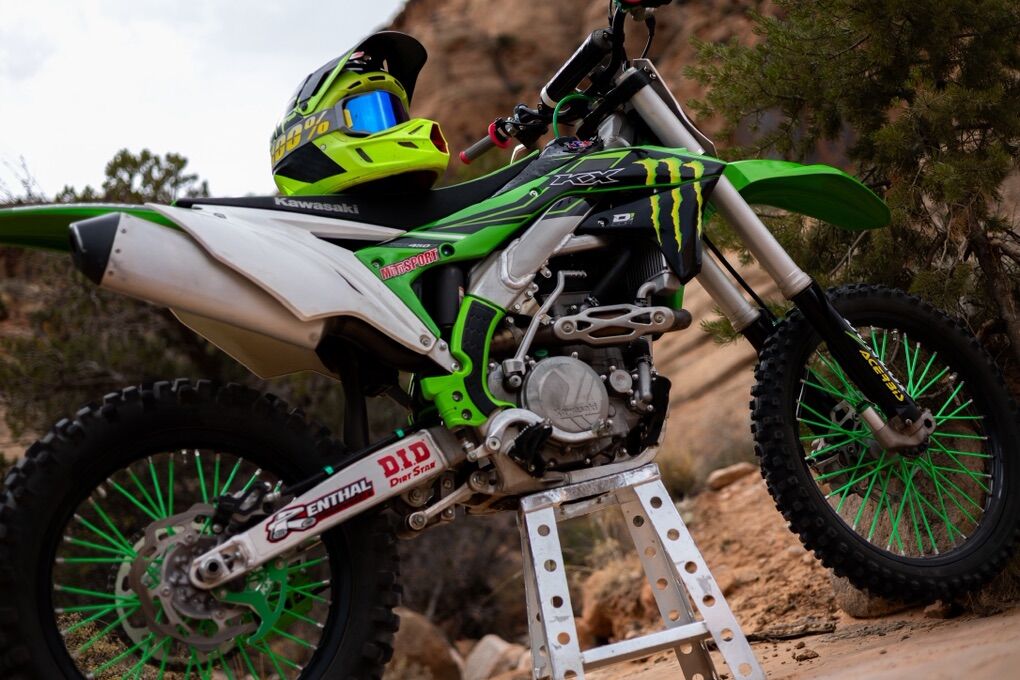 CashApp2016 KX450F Green spoke covers Kx rear brake shield Green frame guards Pink grips New rear tire Green Acerbis chain guide Green brake clamps
