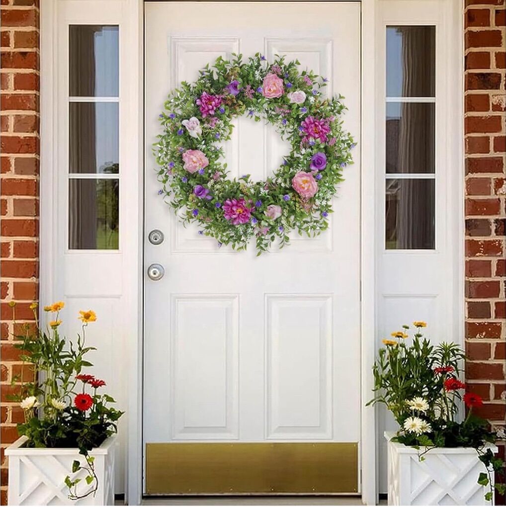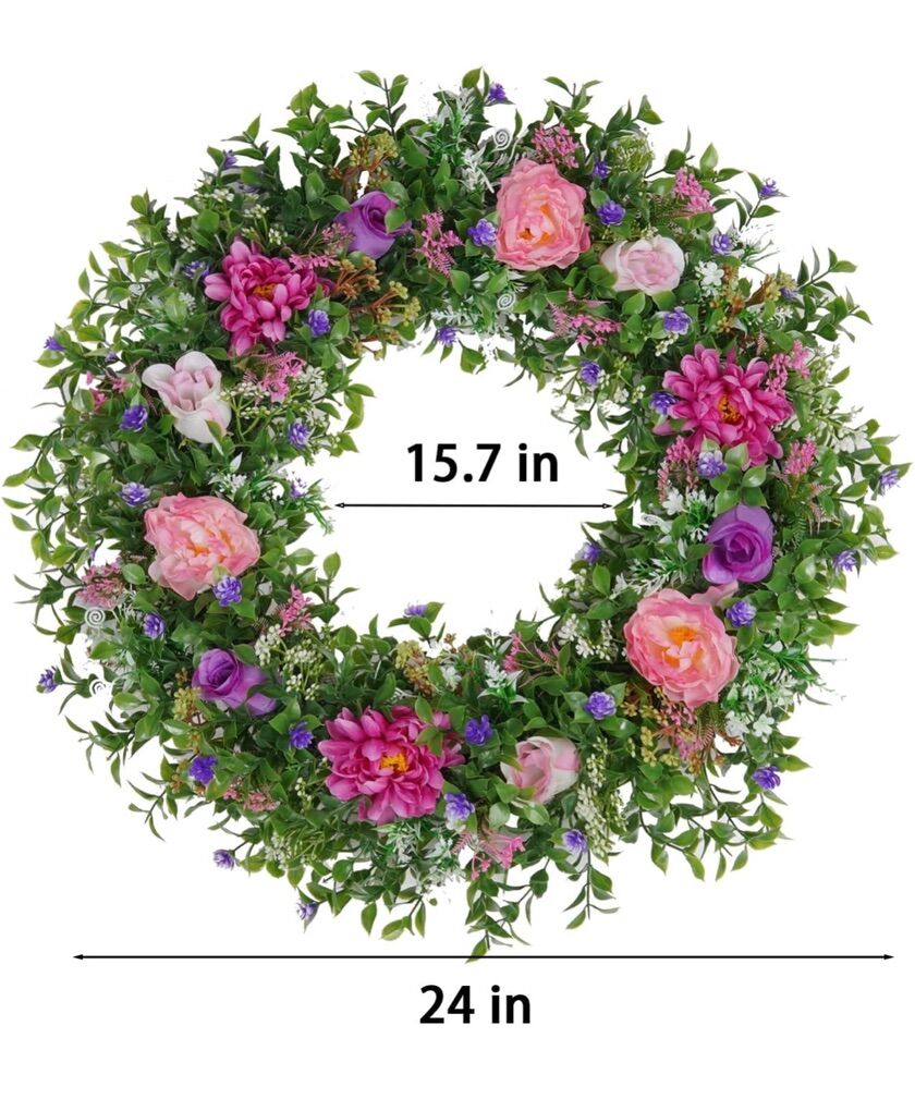 Summer WreathsThe wreath handcrafted from high quality green leaves and colorful flowers,The flowers and leaves on the wreath are very strong, so there is no need to worry about falling off,The wreath looks very full,realistic and beautiful. 24 Inch Spring WreathThis spring wreath measures 24 inch in overall diameter,The wreath is fit inside a box for better protection and transport,Upon opening,please be kind and give the wreath a gentle fluff with your fingertips to restore it to it's original shape.The wreath size is perfect for your front door. Front Door DecorationsThe colorful floral wreath suitable for both indoor and outdoor use. You can hang it above your window, place it on your front door, or on a living room wall. The colorful colors will add life to your home. Easy to InstallThe wreath is made of high quality plastic and artificial flower material,The leaves and flower are lifelike and firm,you can certainly hang them for all seasons, could be used for a few years.The wreath come with a cord to easy to hang.
