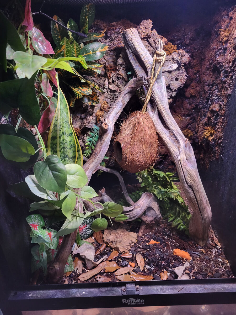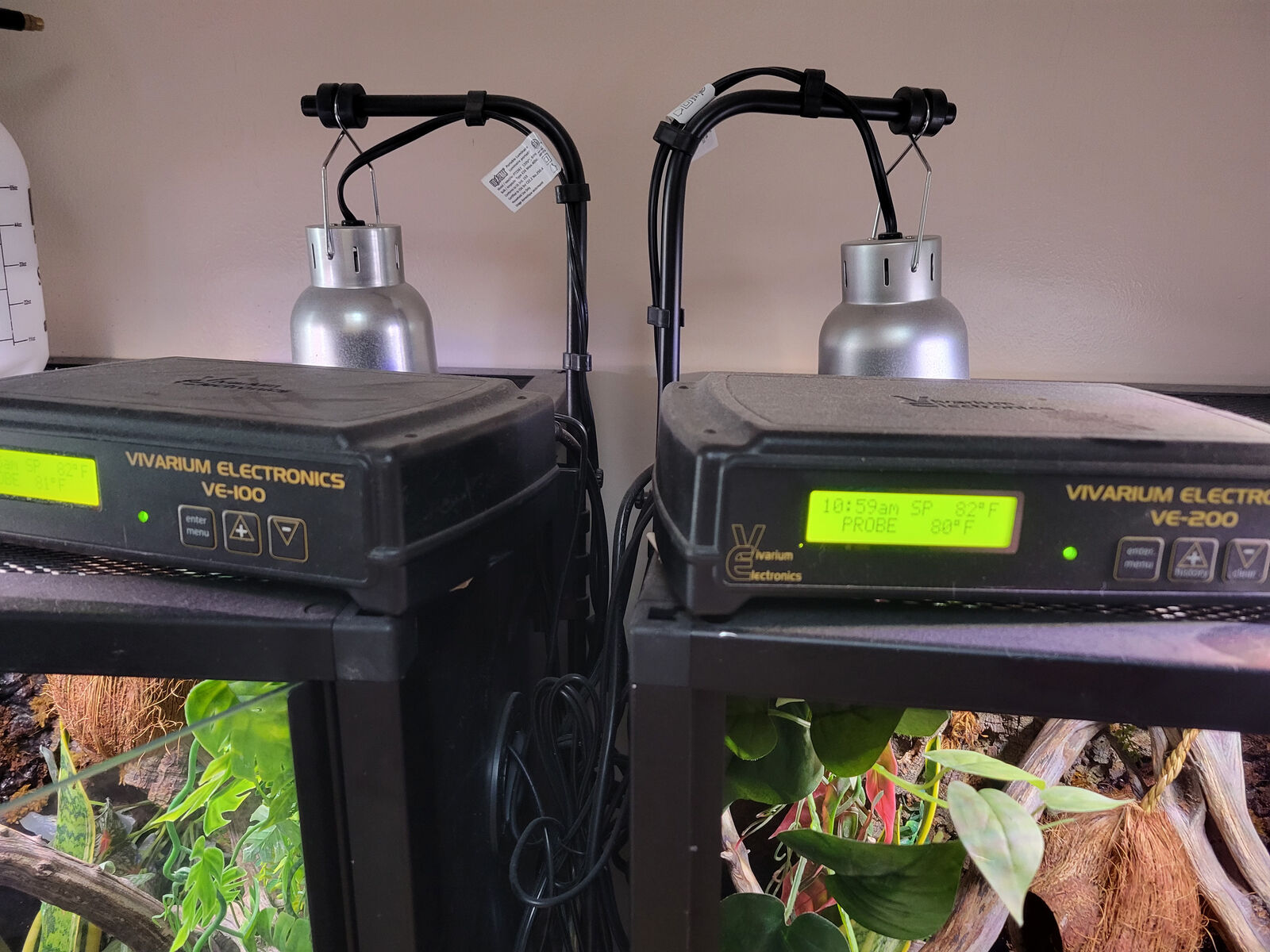 And both of their enclosures. They each have a live snake plant, decor, tons of isopods, springtails, etc. There are grow lights for the plants that have auto-timers, and mini ceramic heaters on each with their own high-quality thermostats.