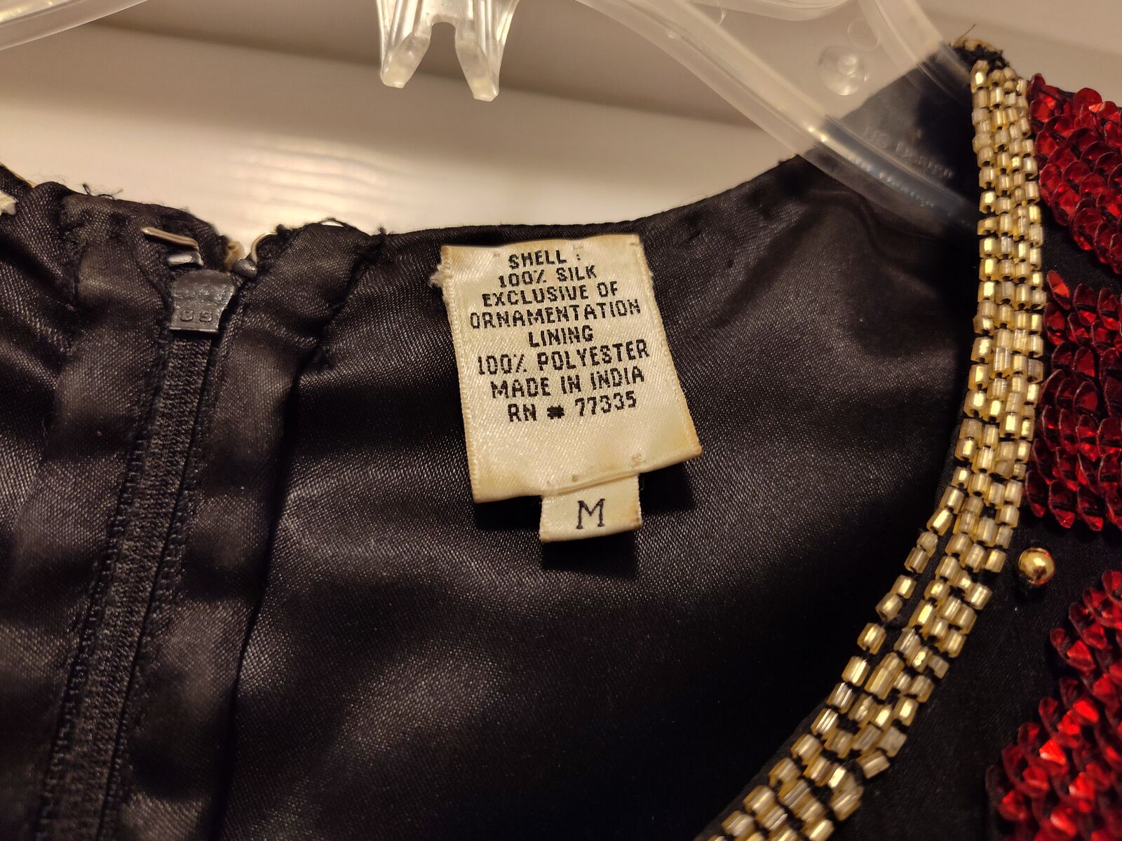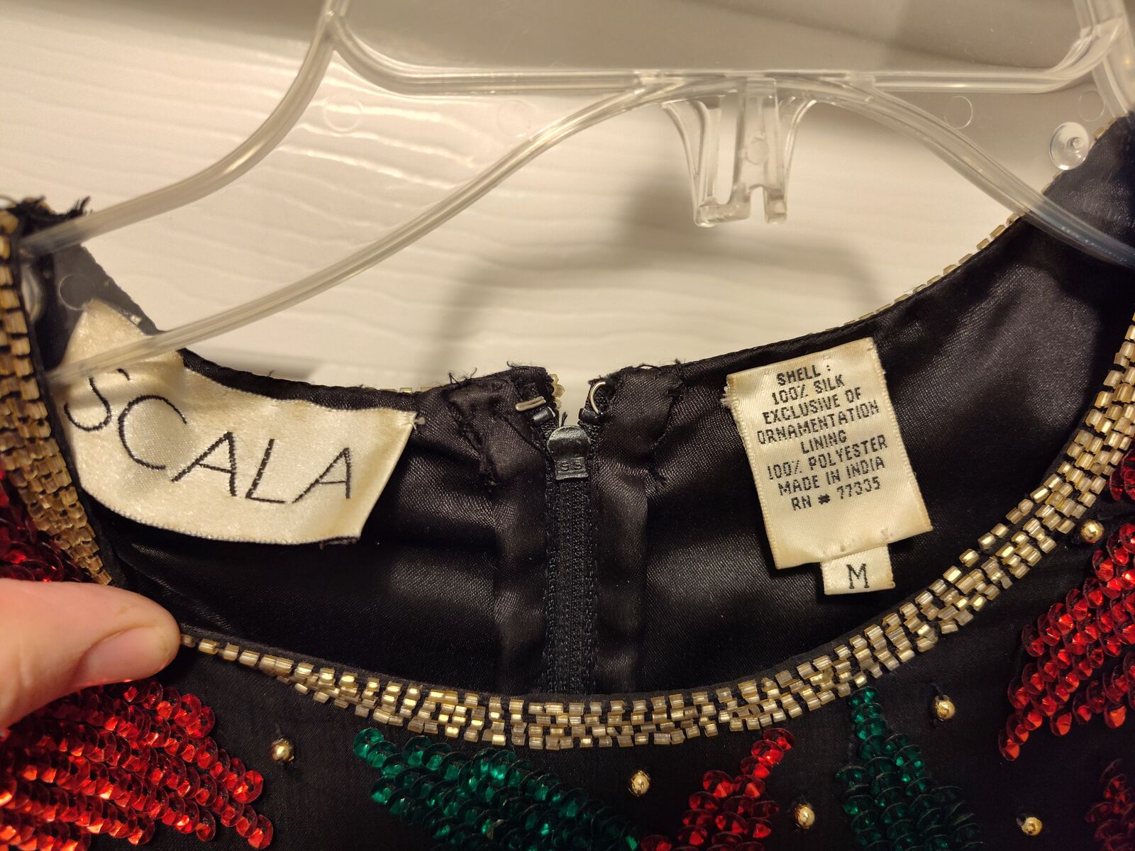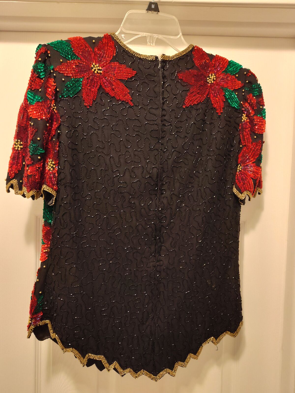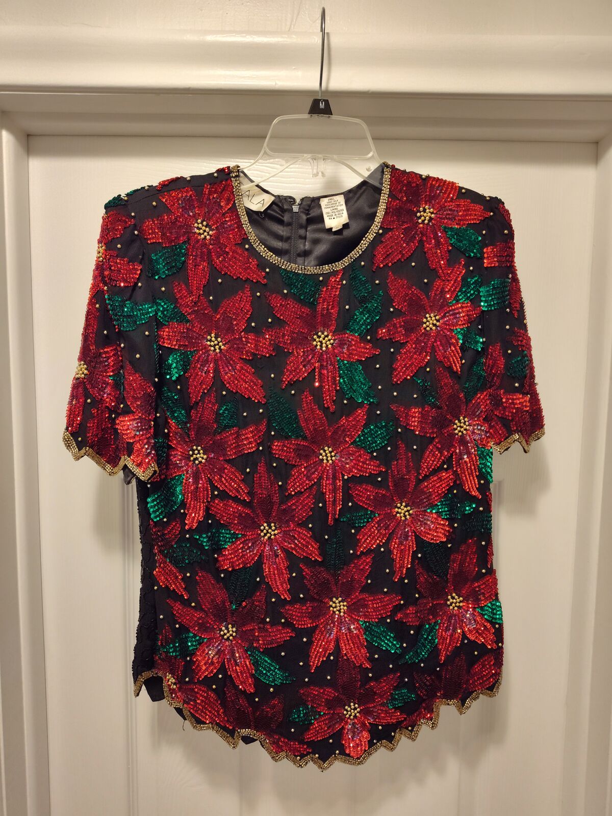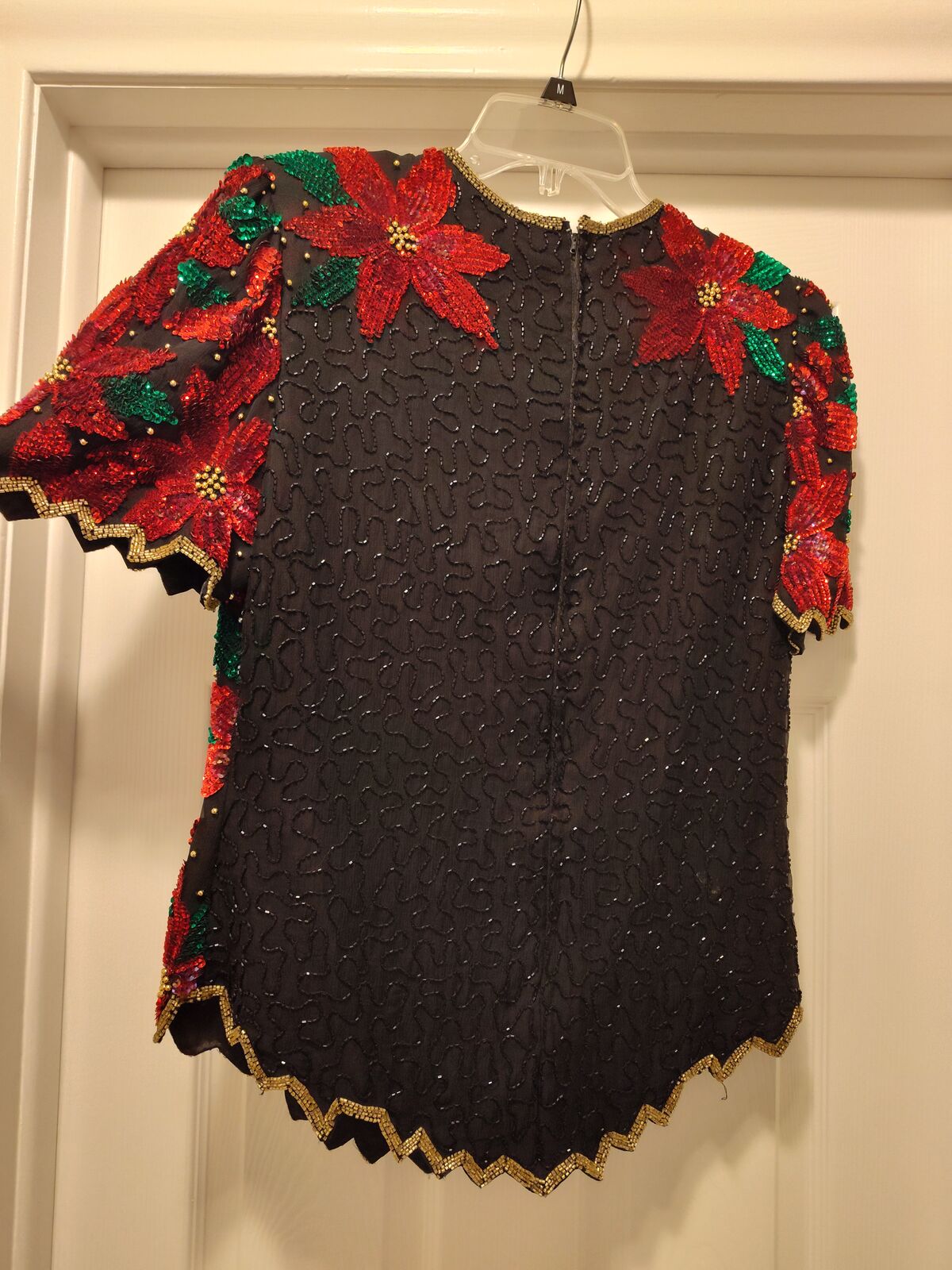 Poinsette beaded sequin top, black and red with green leaves